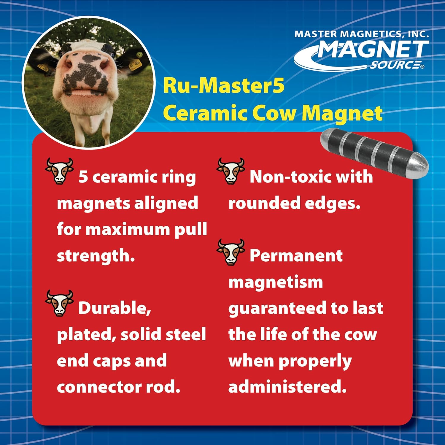 For over 50 years, dairy farmers and veterinarians have trusted the Master Magnetics Ru-Master 5 Cow Magnets to protect livestock. Cow magnets help prevent the harmful effects of cattle ingesting metal objects. While grazing, cows eat everything from grass and dirt to nails, staples, and bits of wire (referred to as tramp iron). Tramp iron tends to lodge in the honeycombed walls of the reticulum, threatening the surrounding vital organs and causing irritation. The cow loses its appetite and decreases milk output (dairy cows) or its ability to gain weight (feeder stock). Cow magnets help prevent this by attracting and holding stray metal from the folds and crevices of the rumen and reticulum.