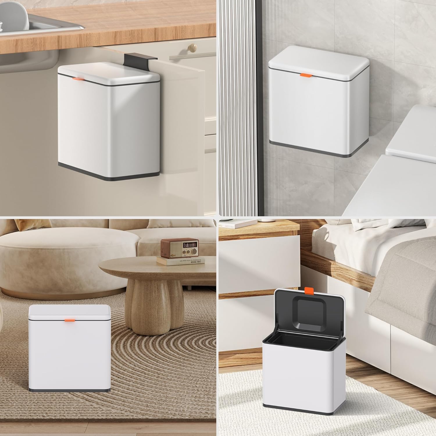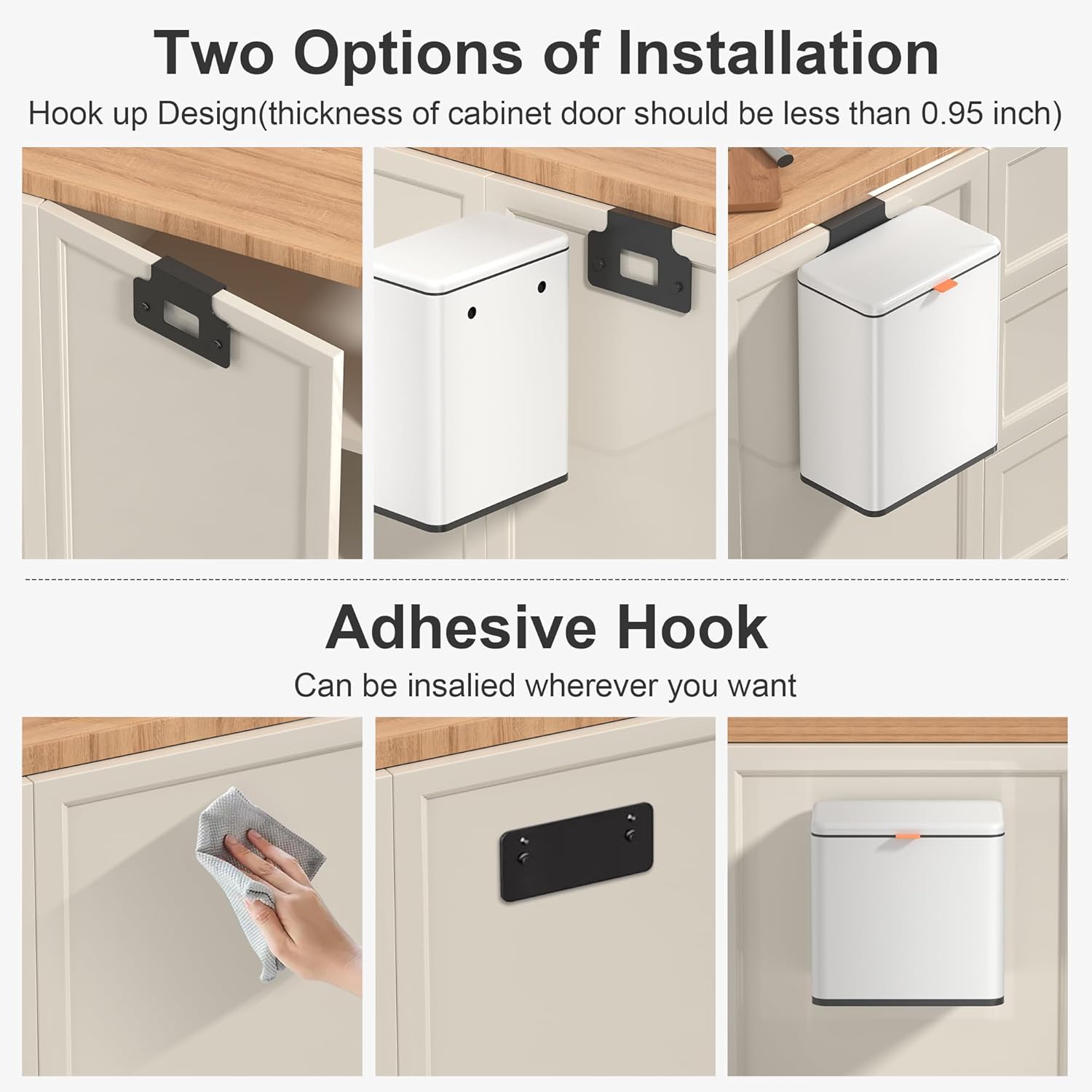 【WALL MOUNTED/COUNTERTOP/ UNDER SINK TRASH CAN】: No need to bend over. The trash can provide Two opening and installation methods,Effortless and Fits for Most Cabinet Doors, Pantry Doors. The thickness of door should be less than 0.98″ (2.5cm). Small trash can can also be glued on kitchen or bathroom wall or under the sink.