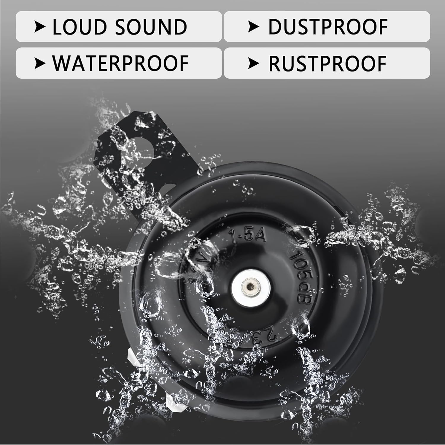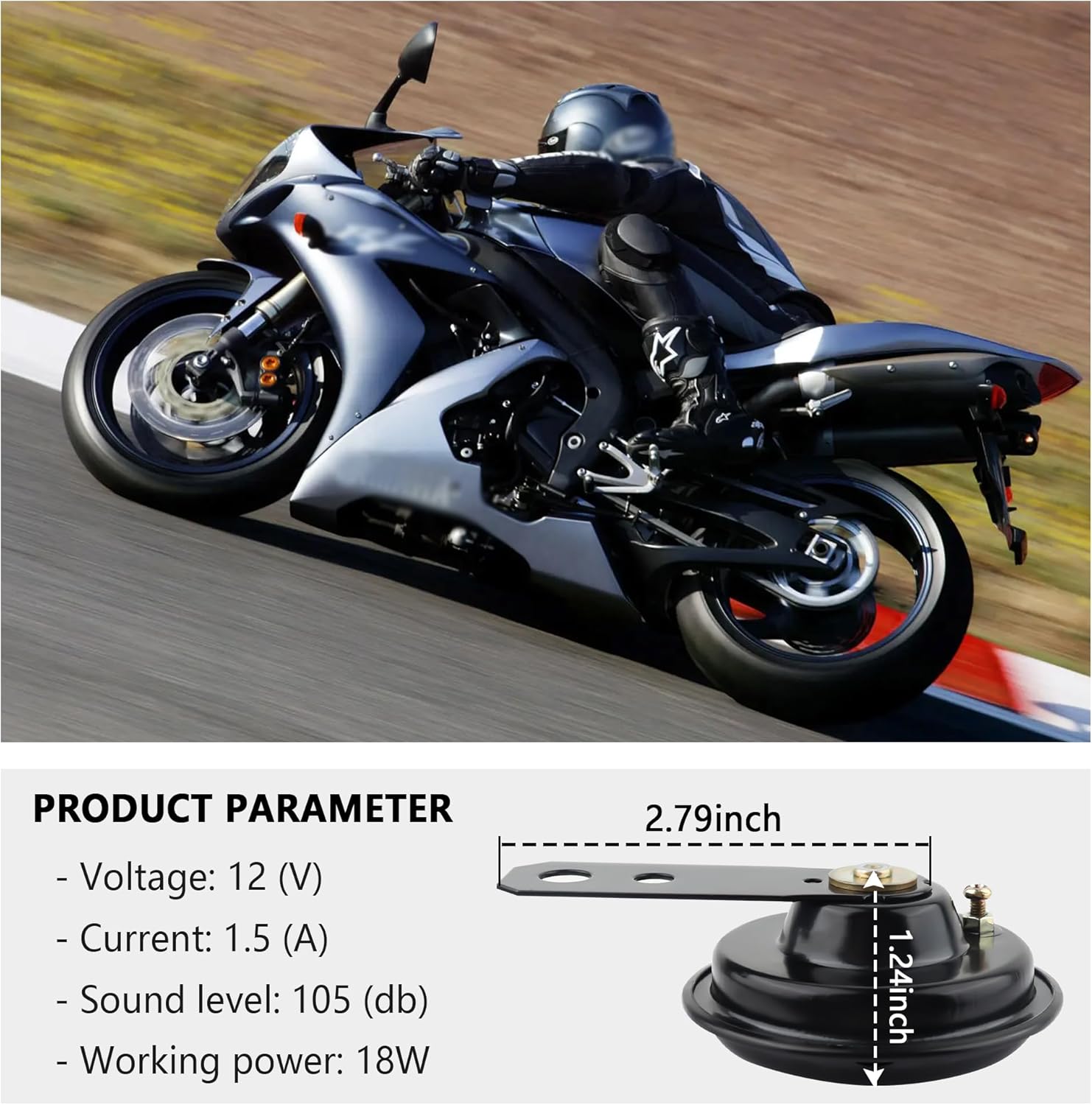 🏍️ CAR HORN PARAMETERS: This loud car horn horn has a diameter of 2.57 inch/65.5 mm, a handle length of 2.79 inch/71 mm, a small hole diameter of 0.25 inch/6.5 mm, and a large hole diameter of 0.33 inch/8.5 mm. Voltage is 12 (V), current is 1.5 (A), sound level is 105 (db). The operating power is 18W.