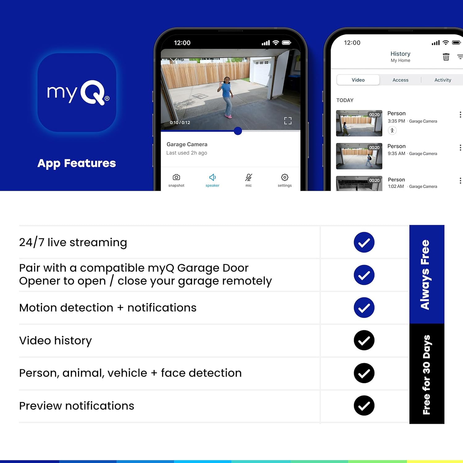 Security for Garage: The ultimate smart camera designed for your garage, giving you the power to see and hear what’s happening throughout your entire home day and night with the myQ app.
