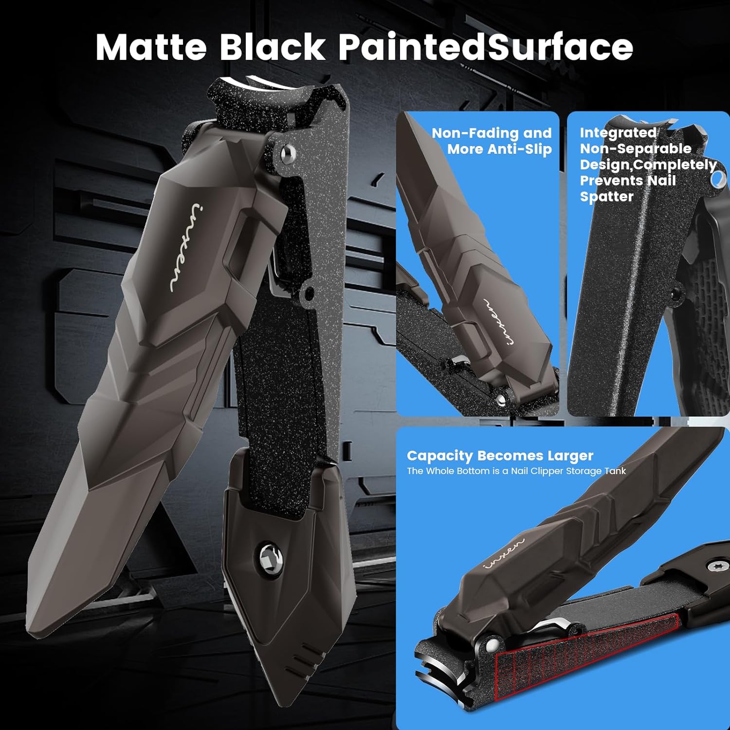 ✔【Premium and Practical】:The nail clipper is made of high-quality stainless steel and zinc alloy with perfectly curved edges, which is durable and has a sophisticated matte black finish. Hardened for long-lasting sharpness, the combination of exceptionally sharp cutting edges and incredible leverage characteristics, Coupled with the extension of the clamp arm, the catcher widens the design greatly improved grip strength to easily handles thick fingernails and toenails keep nails in good shape.