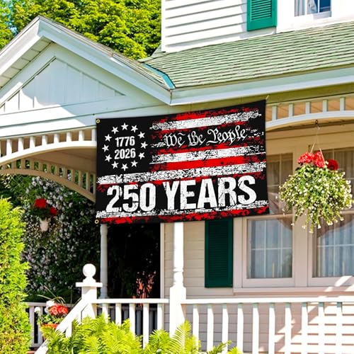 America 250 Patriotic Decorations Material: 250 anniversary usa flag is made of 3-ply washable Spun durable polyester, double solid stitched to improved durability, rain or shine, wind or snow, this flag will maintain its integrity and beauty all season long.