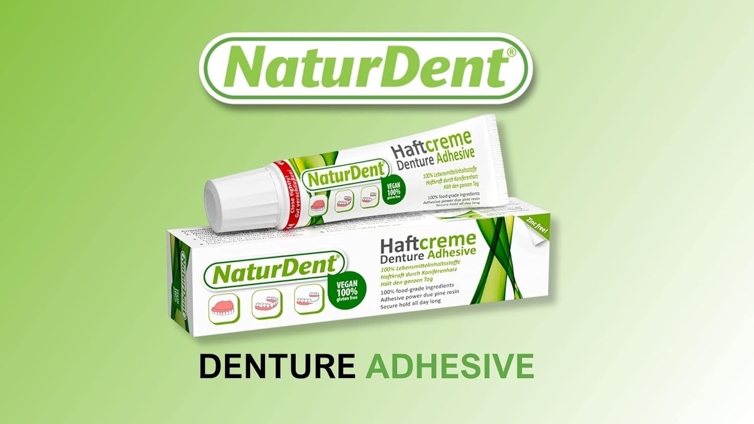 Do you use a denture adhesive?; If yes, this patented denture adhesive cream NaturDent guarantees extra strong and extra-long holding power for upper dentures and especially for lower dentures. Natural pine resin acts as the perfect stabilisier for dentures; no movement, no more slipping and a secure feeling all day long! NaturDent also provides extra protection against food particles trapped under dentures. NaturDent adhesive is a product for those denture wearers who avoid using any denture adhesives because of chemical ingredients. NaturDent is also an alternative product for those who would like to change to an adhesive based on natural ingredients. Try it today.