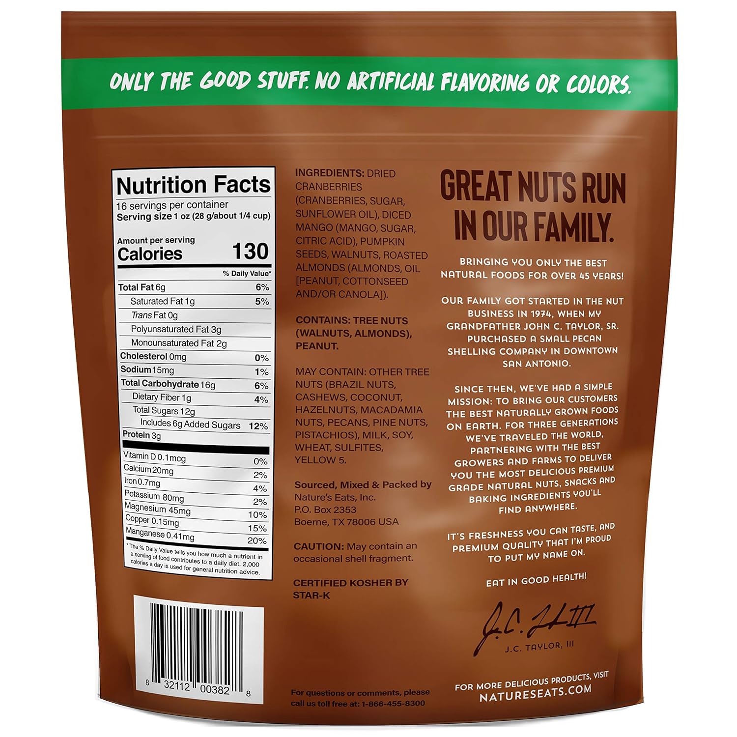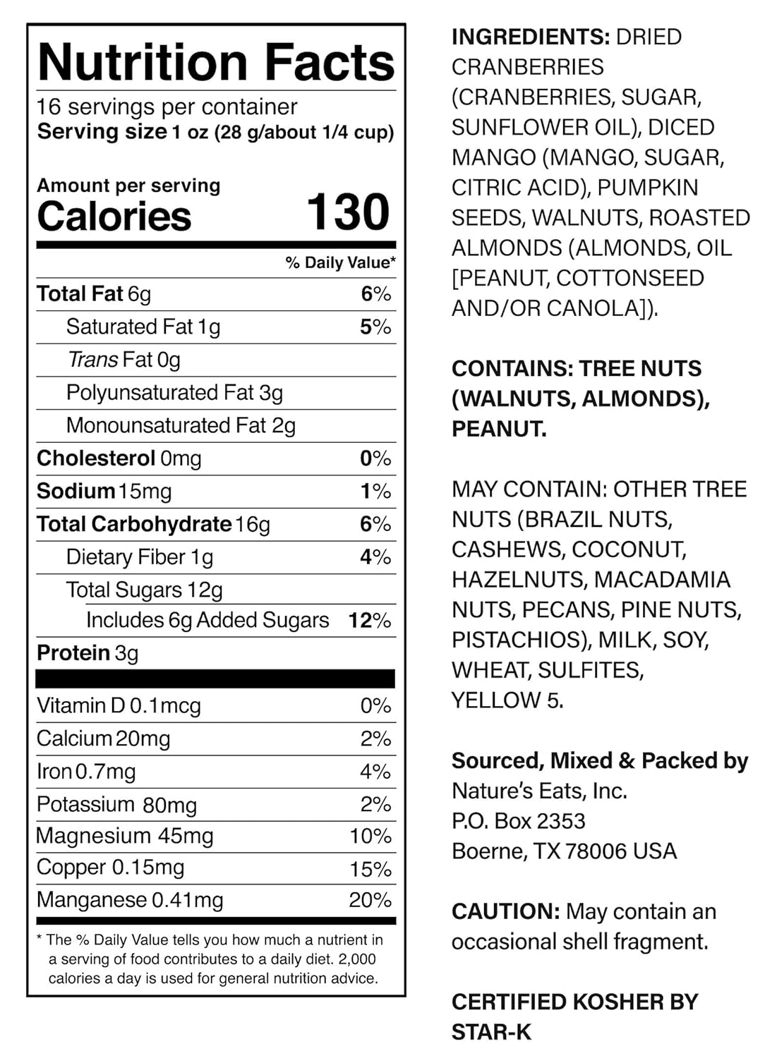 CONVENIENT PACKAGING: Designed in a resealable bag that helps maintain freshness and makes storage simple. Ideal for keeping in the pantry, backpack, or office drawer while providing easy access to a clean, Kosher-certified fruit and nut trail mix.