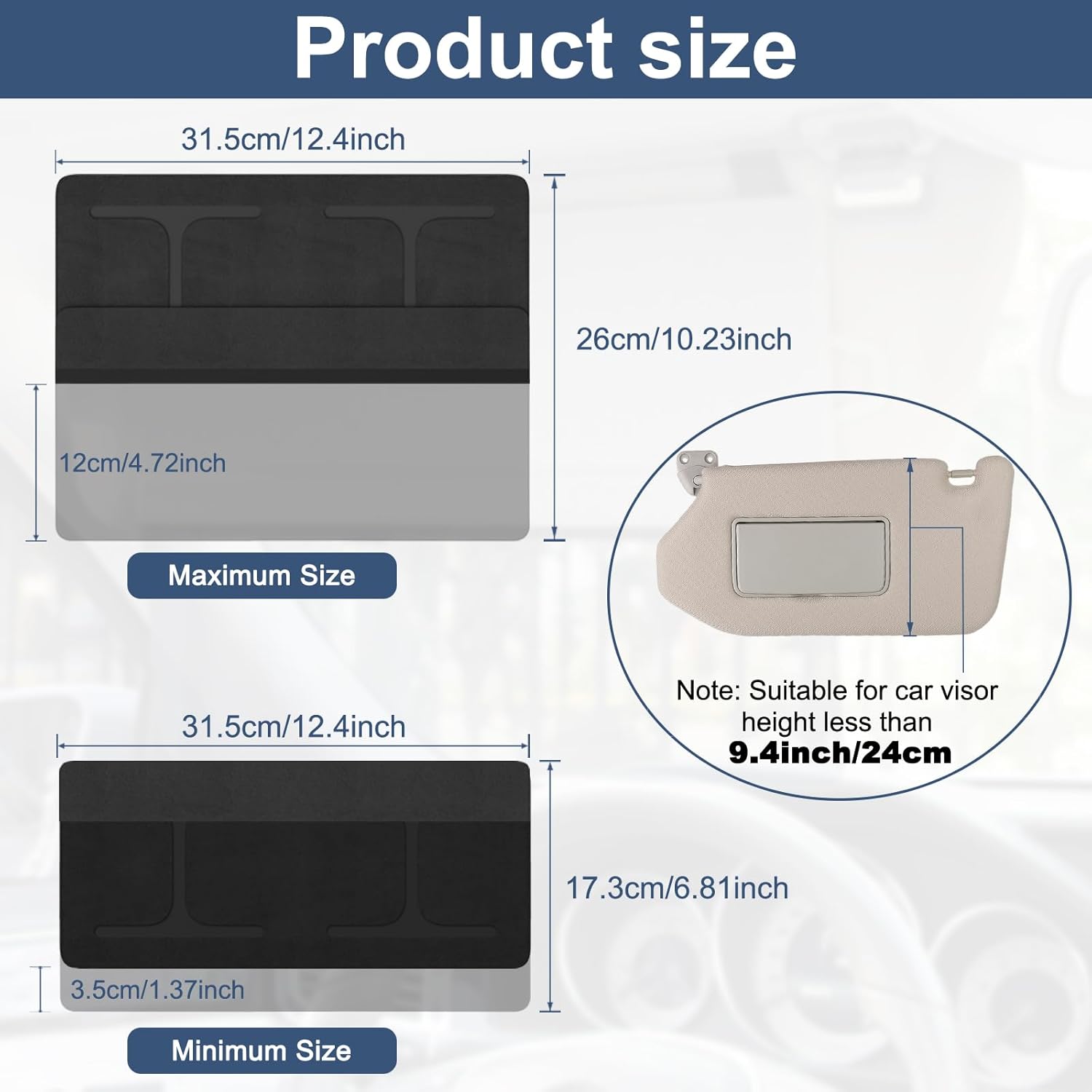 Adapted Size: The height of the car’s own sun visor is less than 9.4inch/24cm.