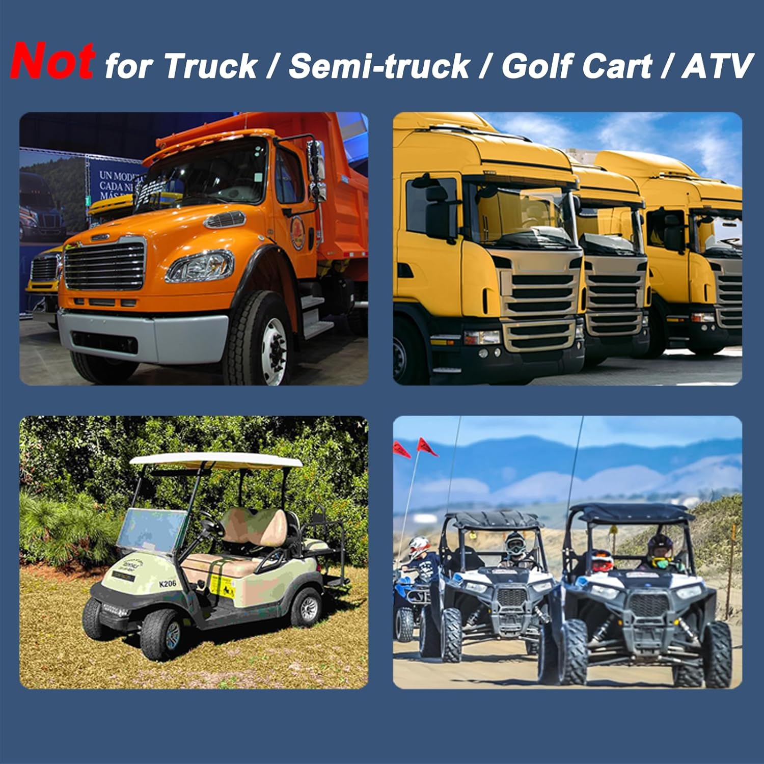 Adapted Vehicles: Car √, SUV √, Minivan √, Pickup Truck √, Truck ×, Semi Truck ×, Golf Cart ×, ATV ×