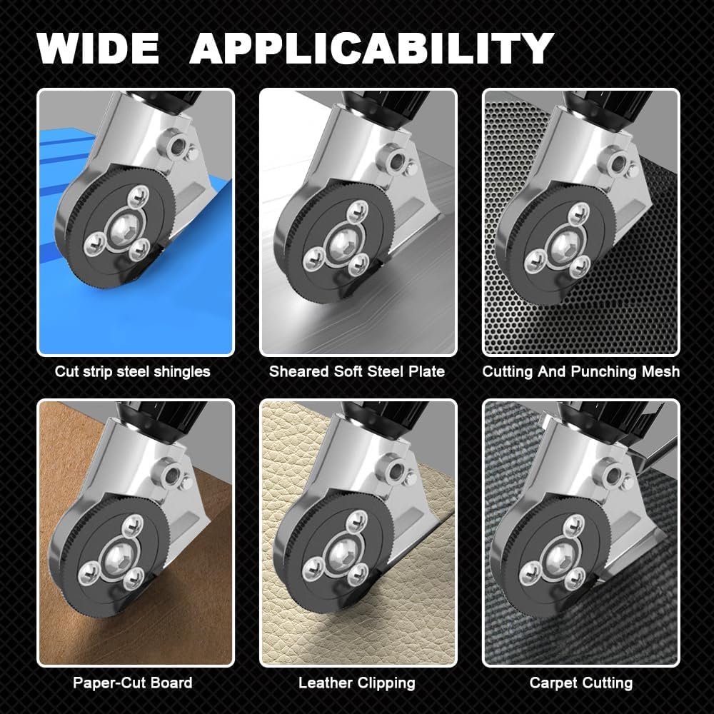 【ENHANCE YOUR CUTTING EXPERIENCE WITH THE VERSATILE】Electric Sheet Metal Cutter Drill Attachment. This heavy-duty tool effortlessly cuts through a variety of materials, including cardboard, leather, iron, sheet iron, steel, copper and aluminum.Perfect for DIY enthusiasts and professio