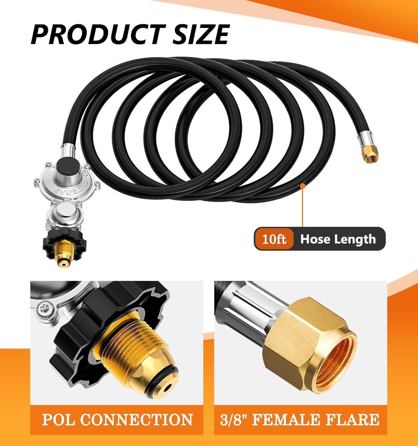 NUPICK 10FT Two Stage Propane Regulator with Hose, Propane Line with Regulator Standard POL to 3/8″ Female Flare, 11″ WC Pressure Output, for RV Appliances, Fire Pits, Gas Grills, Heaters, Generators