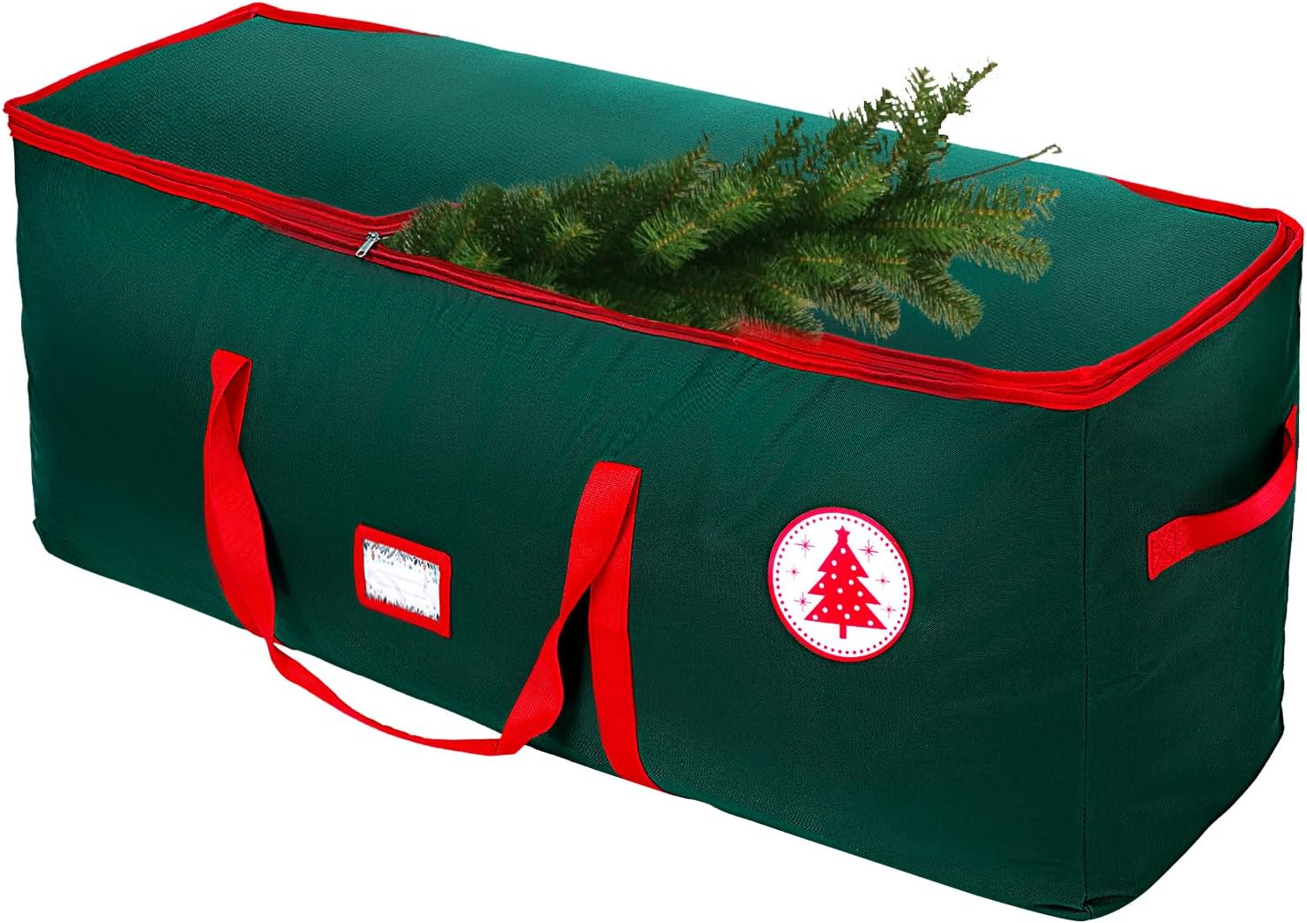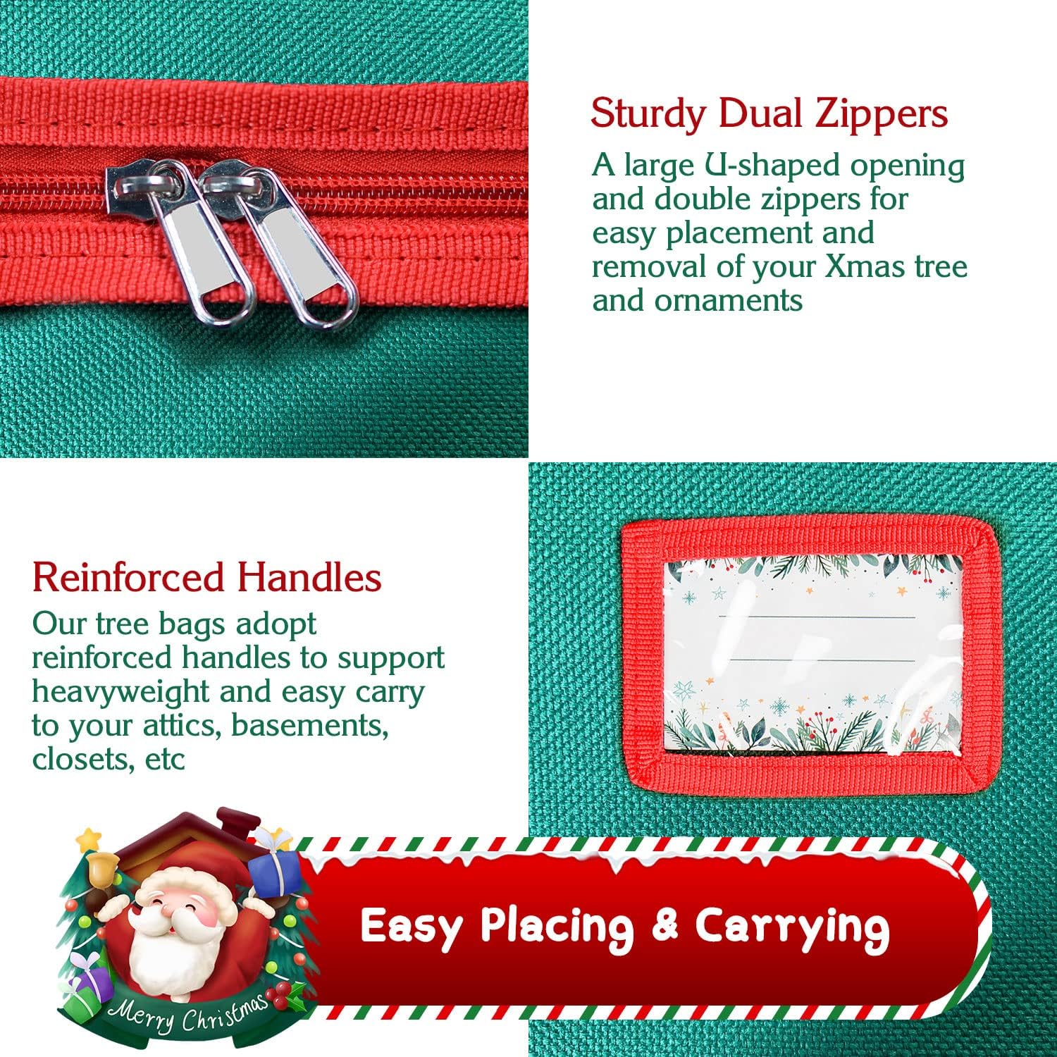 Big Sizes: Stores separately the artifical Christmas tree and Christmas ornaments for better protectionLarge Capacity: Fits up to 7.5ft disassembled Christmas tree & Christmas decorationsWaterproof, Tear-resistant Oxford Material: Protects and preserves your Xmas trees & ornamentsLarge U-shaped Opening & Double Zippers: Opens extra wide for easy storing and removal of your Christmas trees & ornamentsTree Bags with Reinforced Handles on top and side for convenient carryingClear Labeling Slot: Helps you easily identify what’s inside the Christmas tree storage bag