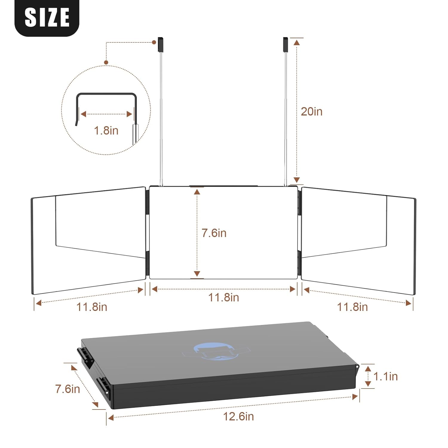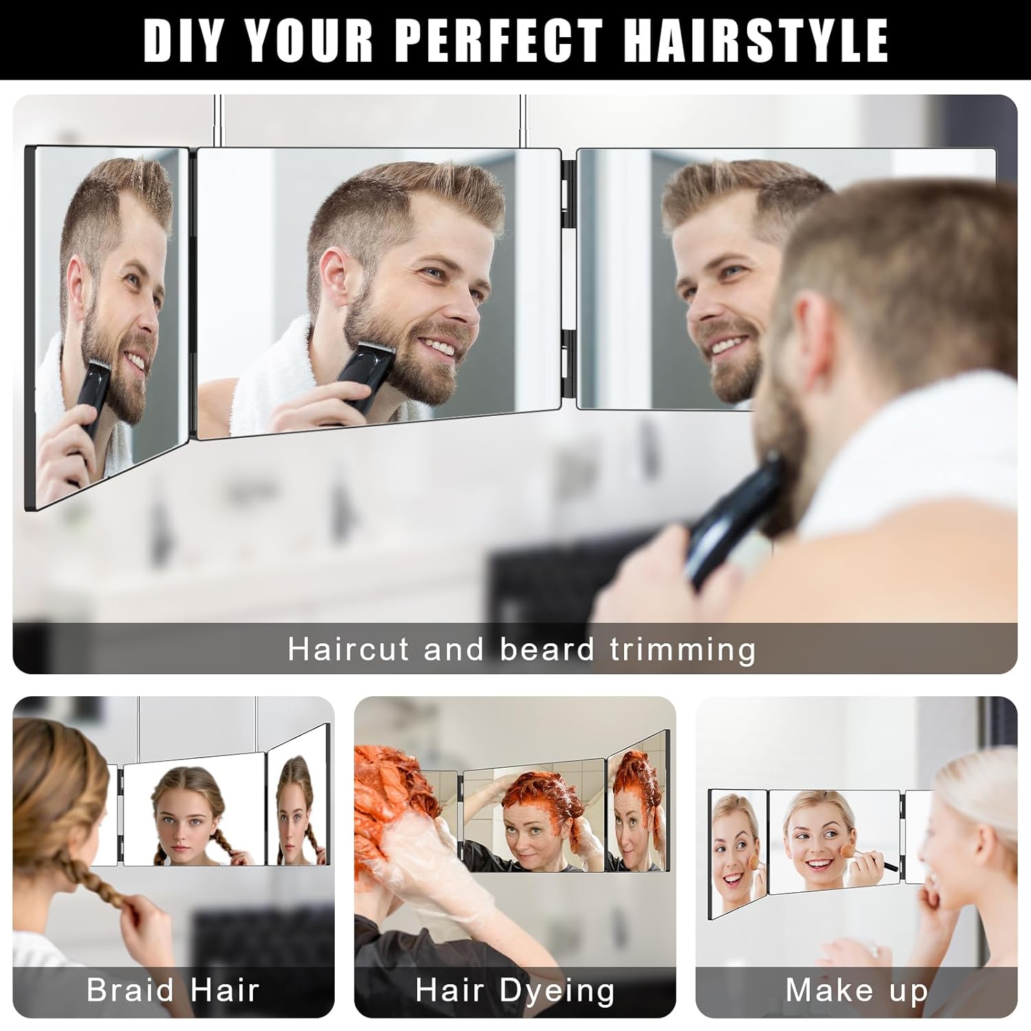 360 Degree View – The 3 way mirror provides a 360 degree view to eliminate blind spots and easily adjusts the angle of the mirrors on both sides to see the back of your head, allowing you to comfortably see all angles of your head for haircutting, shaving, dyeing, styling, and makeup application.