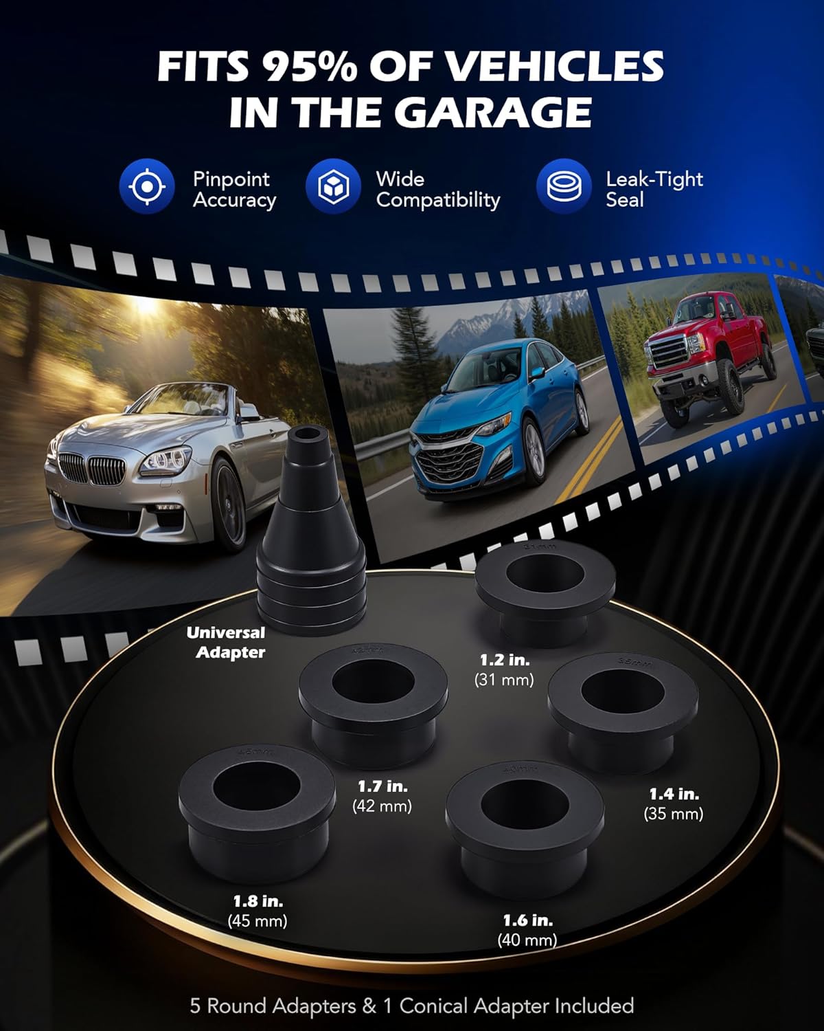 Works on Almost Every Radiator: With 5 different adapters (1.2, 1.4, 1.6, 1.7, & 1.8 in.) and a conical adapter, plus US, EU, and Japanese standard fittings, this coolant fill kit adapts to most coolant bottles for hassle-free refills