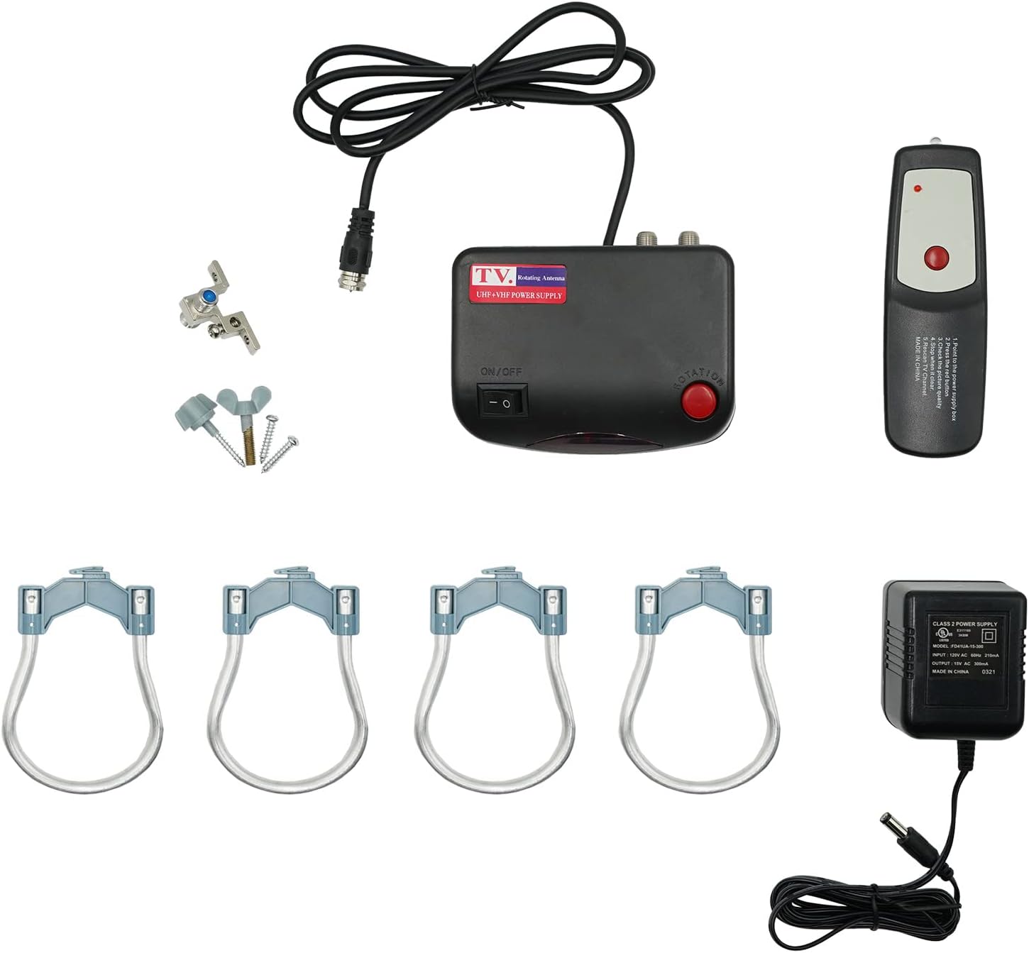 What you get–HDTV Outdoor antenna built-in amplifier,Remote Control,Power Supply,Coaxial Grounding Block,Antenna Parts.
