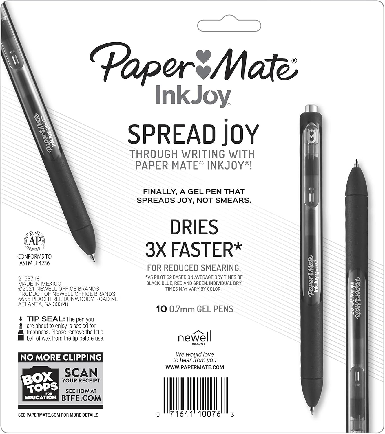 Spread joy (not smears) with Paper Mate InkJoy Gel Pens. With vivid gel ink that dries 3X faster* for reduced smearing, it’s like a party on the page where smudges aren’t invited. Brilliant color ensures your writing will be bright and filled with fun. Fully wrapped with a comfort grip, Paper Mate InkJoy pens have a smooth style that keeps the joy flowing as fast as your thoughts. *vs Pilot G2 based on average dry times of black, blue, red, and green. Individual dry times may vary by color.