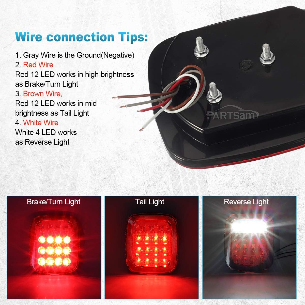 [EASY TO INSTALL] White wire is the GROUND; White+Red, red light is high brightness; White+Black, Red light is low brightness; White+Blue, White lights light up as reverse/backup lights.