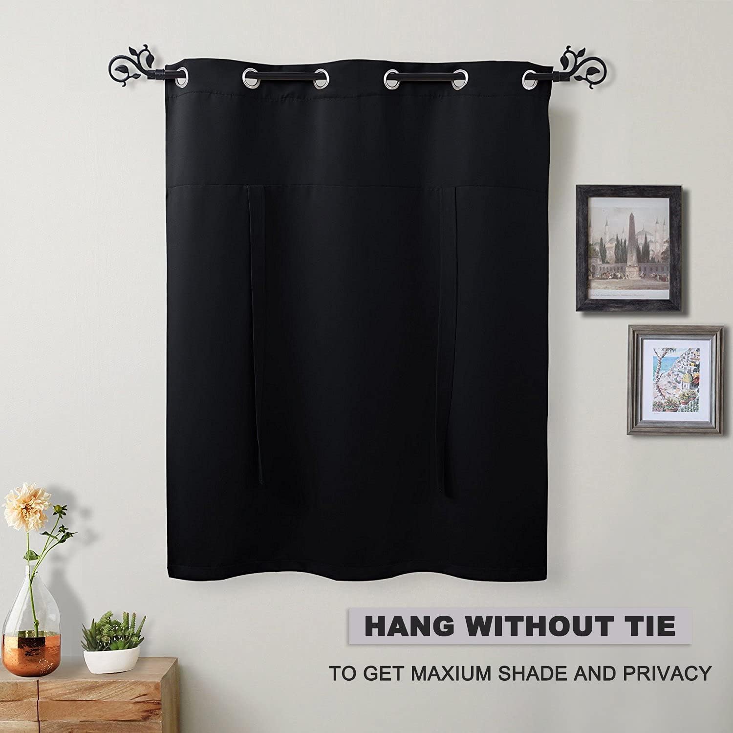 READY MADE – Includes 1 Tie Up Shade measuring 46″W by 63″L. The WIDTH fit 42″ max window(the panels can’t be fully unfolded due to grommet top). 1.6″-inner diameter grommets fit most standard curtain rod/pole