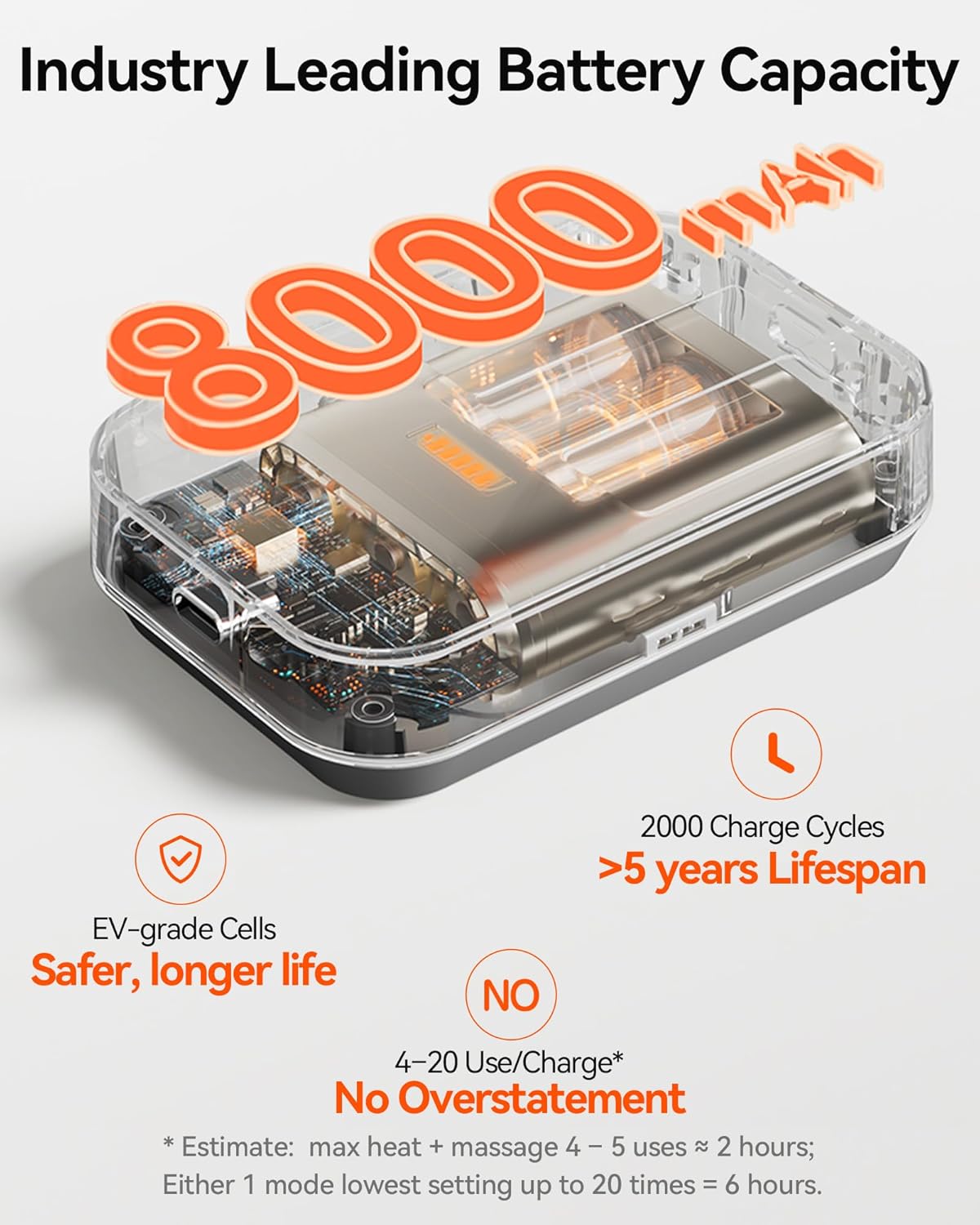 ⚠️NOTE BEFORE PURCHASE:(1)The device automatically turns off after 20 minutes for safety. You can turn it on anytime. But be cautious with skin irrtation. (2)Please use a 5V/2A adapter for charging. Using high-voltage chargers may shorten battery life.(3)Typical runtime per full charge (20-min/session): Max heat + vibration: 4–5 sessions; High heat: 5–7; Vibration only: 15–20. With the 8000 mAh large battery you should get about 4–5 sessions per charge on Max heat + vibration. If your unit runs less than 3, message us—we’ll replace it within 2 years.