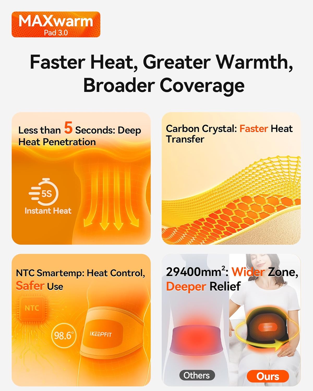 IKEEPFIT: OUR PROMISE — We have focused on heating & massage solutions since 2005. Our MAXwarm pad has evolved through five generations, shaped by real customer needs. We test every unit, stand behind it with a 2-year warranty, and provide 24/7 support—while continuing to listen, improve, and launch smarter heat products. Slogan: Cordless and full relief, i keep fit anywhere. A promise of comfort, backed by care.