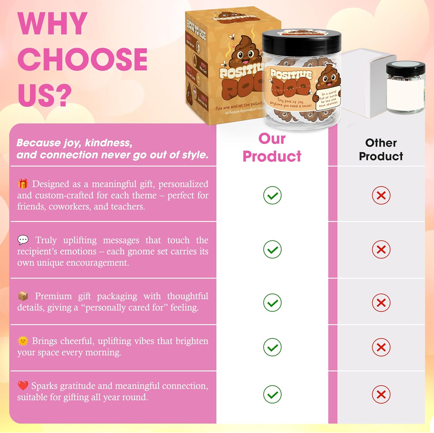 When life feels like a pile of… well, you know — grab your Positive Poo Jar and turn your crappy day into a happy one! Inside this funny little jar are 60 positive affirmation cards, each shaped like a smiling poop emoji and filled with words of encouragement, humor, and charm. Whether you need a quick laugh, a pick-me-up at work, or a lighthearted reminder that you’re doing great, these tiny poos of joy are here to remind you that even when things stink, you still sparkle!