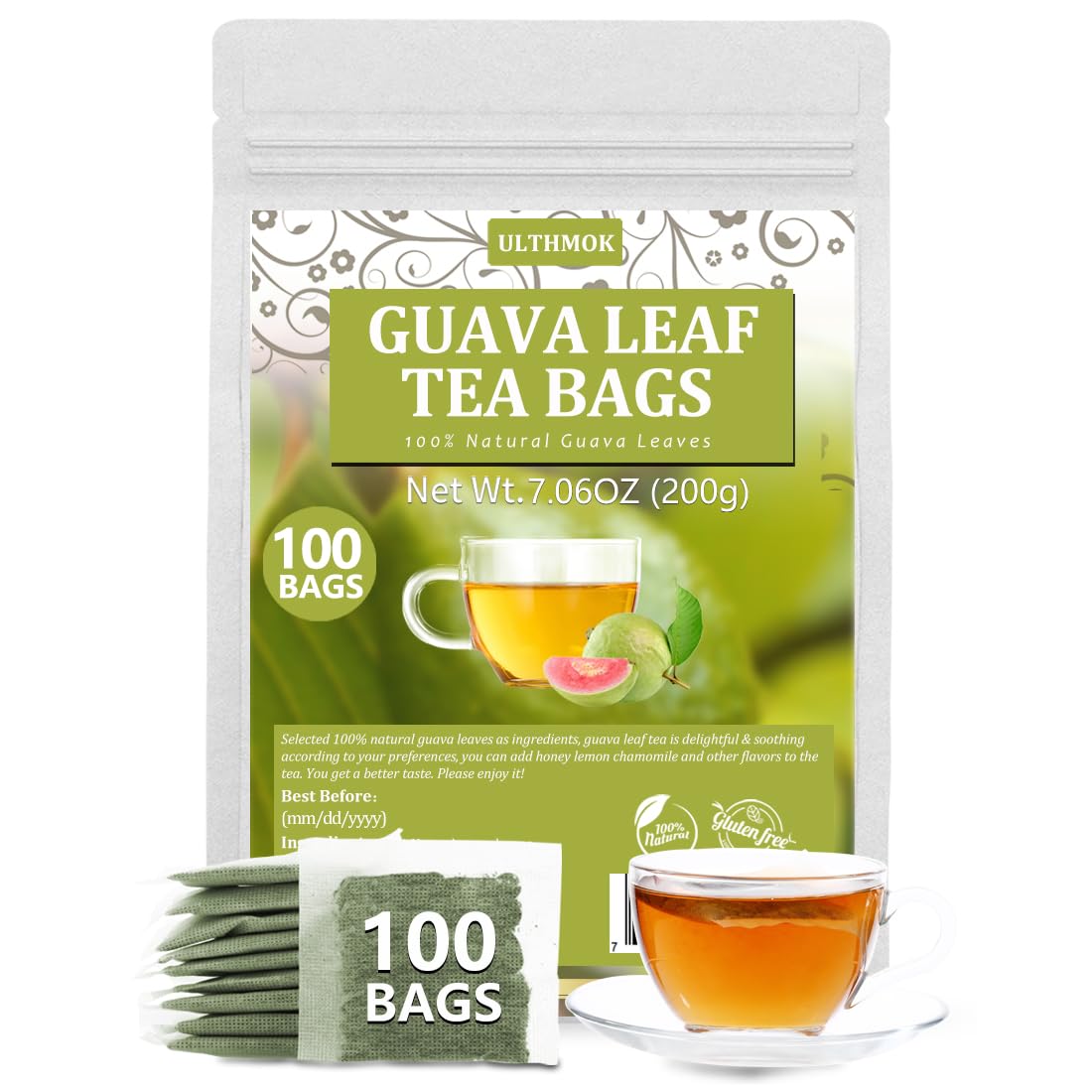 Premium 100 Guava Leaf Tea Bags, Made with 100% Natural Guava Leaves, No Additives & Caffeine Free.