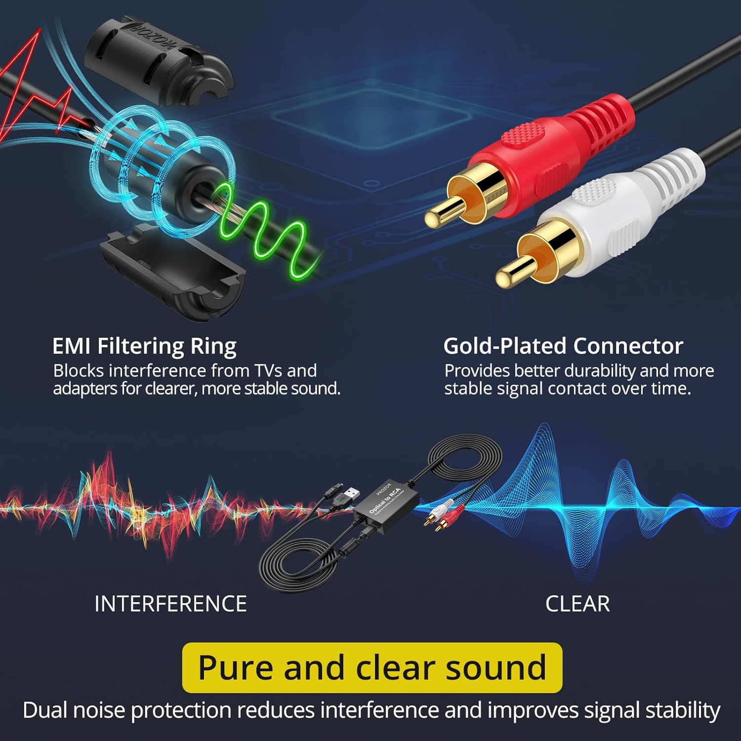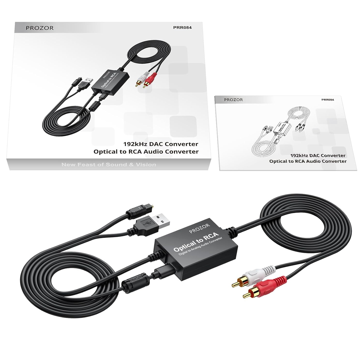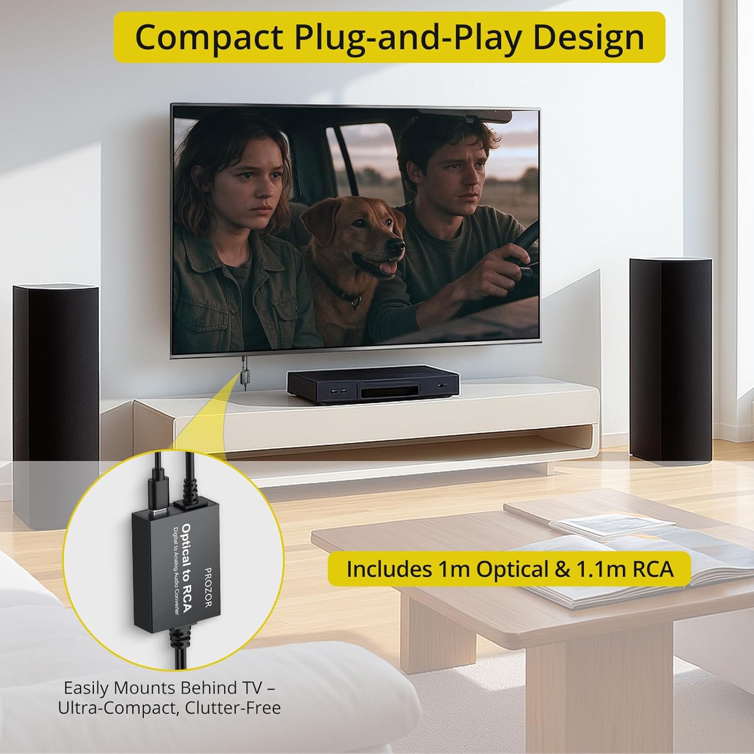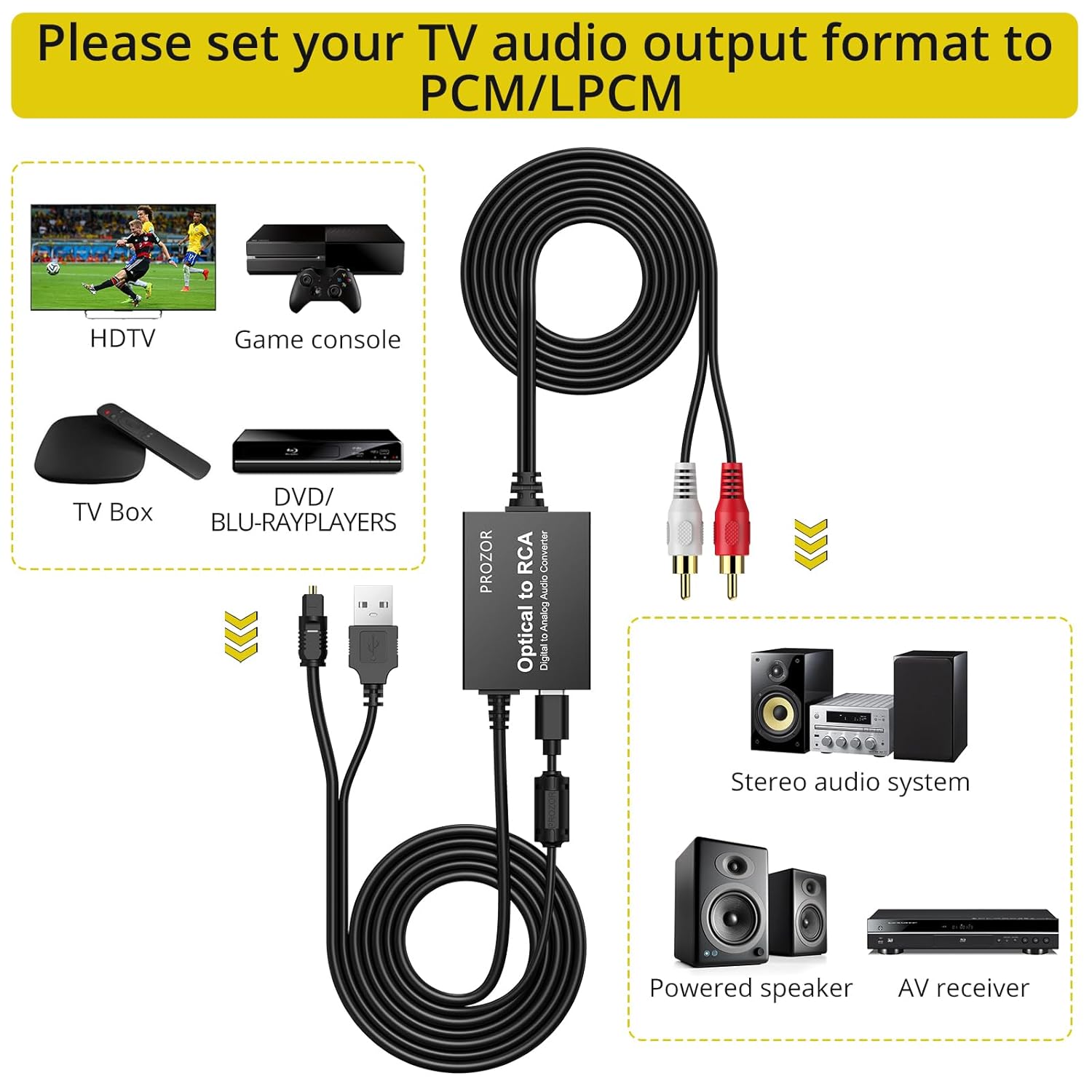 PROZOR Optical to RCA Converter: This digital to analog audio converter transforms SPDIF digital audio signals into analog L/R RCA audio, ensuring high-quality sound output ——⚠️Set TV audio output format to PCM | 📌Adjust TV volume via settings | 📌Optical output not supported
