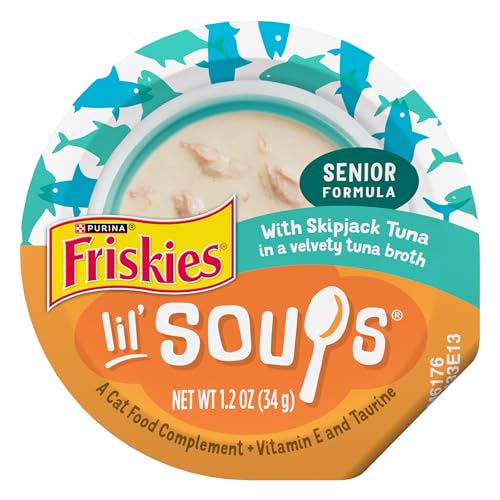 Purina Friskies Grain Free Senior Lickable Cat Food Toppers Lil’ Soups with Skipjack Tuna in a Velvety Tuna Broth – (Pack of 8) 1.2 oz. Cup