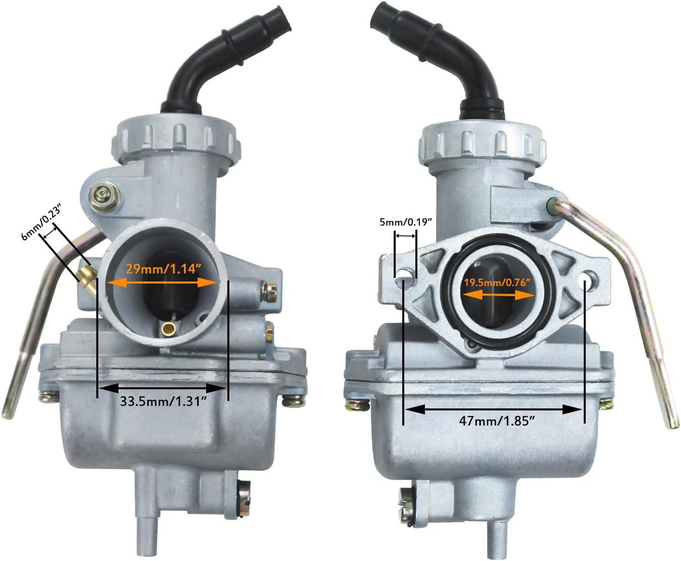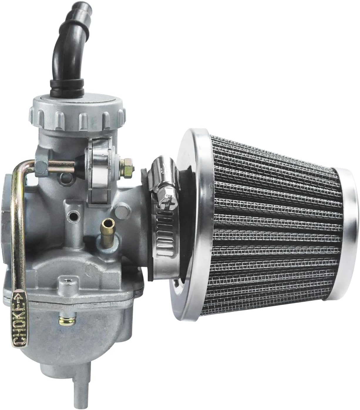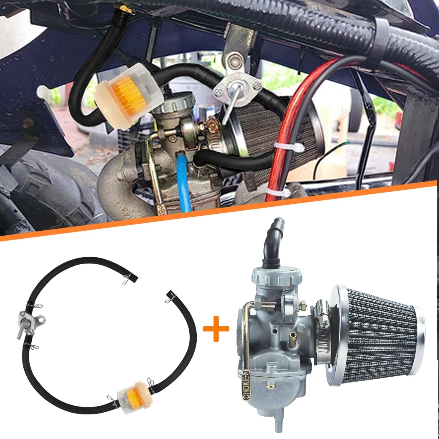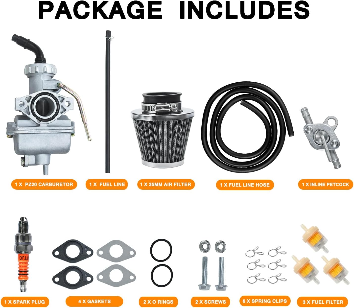 Package Includes —1 x PZ20 carburetor, 1 x 35mm air filter, 1 x fuel line, 2 x gaskets, 2 x intake manifold gaskets, 2 x O rings, 1 x spark plug,1 x fuel line hose , 3 x fuel filter , 6 x spring clips , 1 x inline shut off valve petcock.