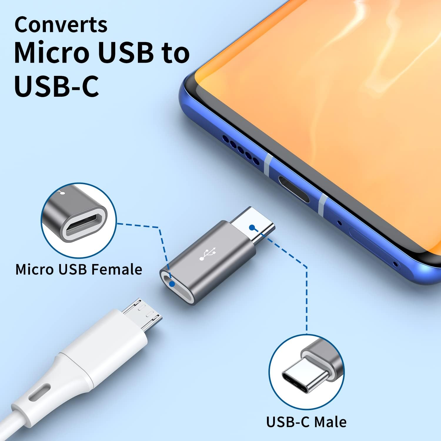 ⍟Micro USB Female to USB-C Male Adapters⍟ Allow you to sync, charging and data transfer for your USB C device with standard micro USB cords.(Note: No OTG compatibility).