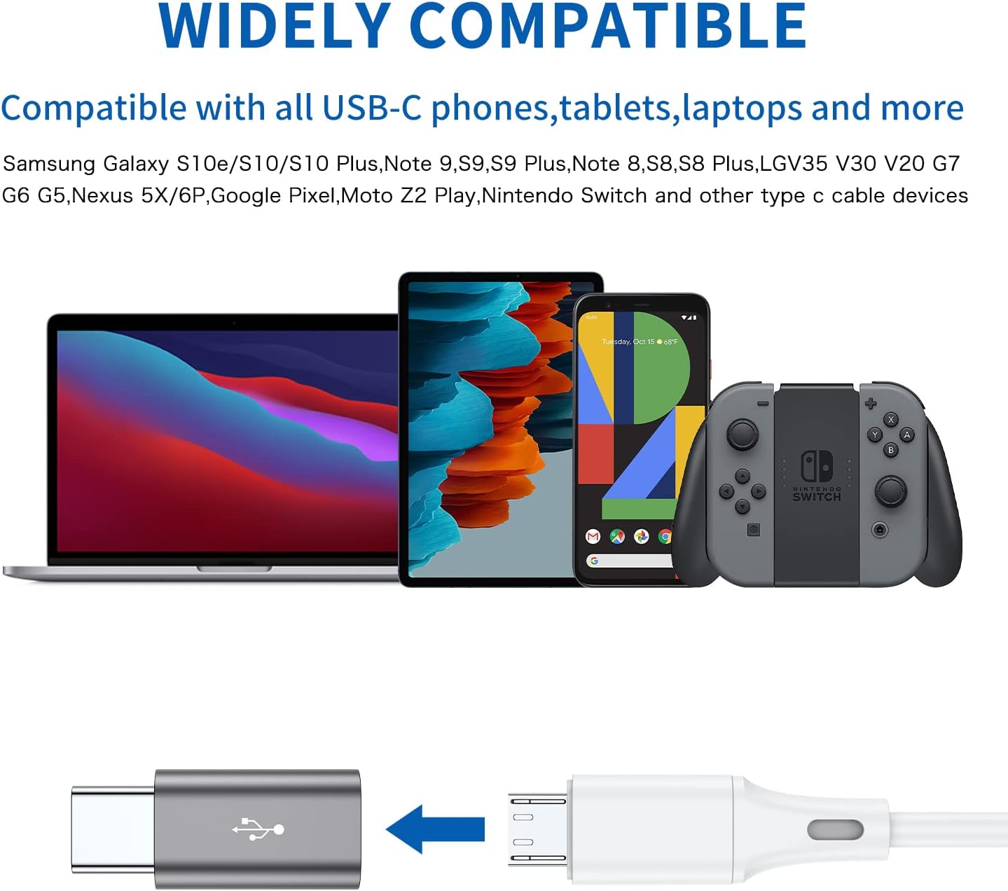 ⍟ Widely Compatibility⍟Micro USB with Connectors is compatible with all USB Type C devices, such as cell phone active Samsung Galaxy Note8 9, s10+ s9+ S8+, LG V30 V20 G6 G5, Nexus 5X 6P, Google Pixel C Pixel 2 XL, Apple Macbook Pro, ChromeBook, Moto G5 Z Z2 Play Force, HTC U12 U11 10, OnePlus 2 3 3T, Microsoft Lumia 950 950XL, Sony XZ, Huawei Honor 10, Blackberry Keyone, GoPro Hero 5 and more.