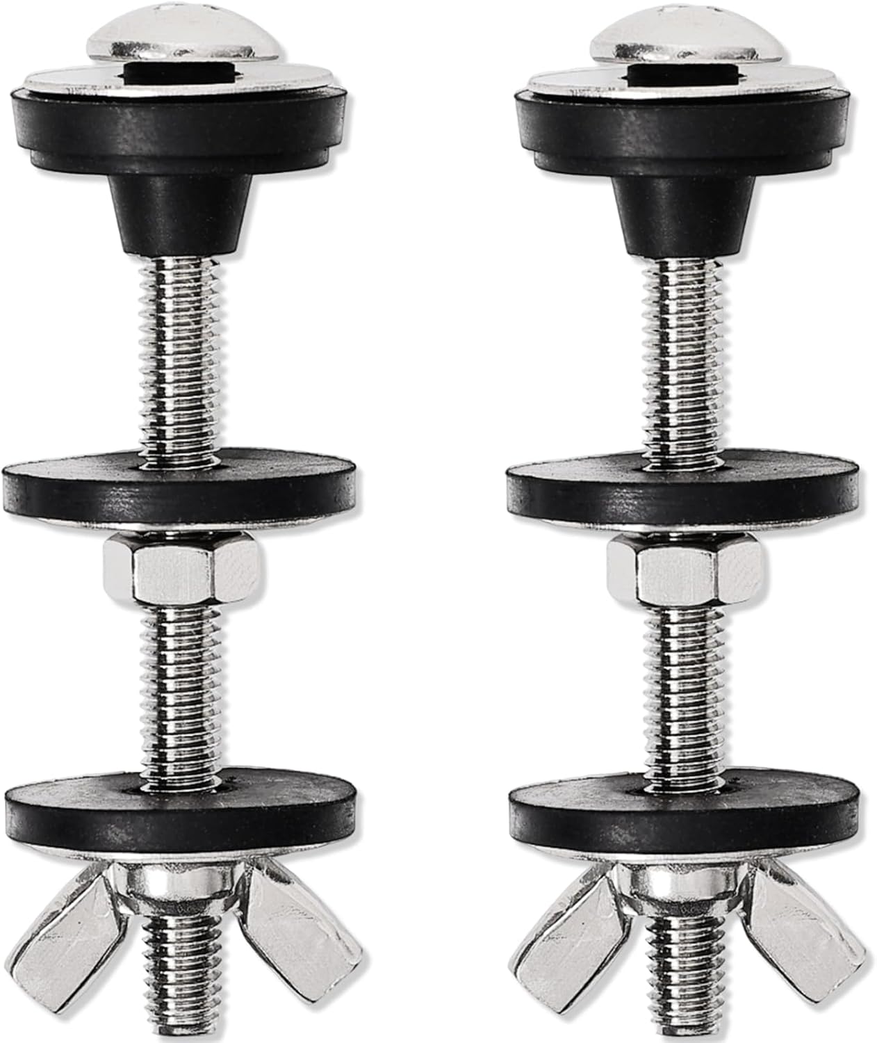 PACKAGE INCLUDE – [2PCS M6 304 stainless steel bolts, 2PC compression cone seal, 4PCS rubber washer, 6PCS flat washer, 2PCS hex nut, 2PCS lock wing nuts] *1 packet. The accessories of each package are complete and professionally matched, to provide a better solution for your water tank bolt problem, to ensure that the toilet tank bolt can be durable and no longer leak
