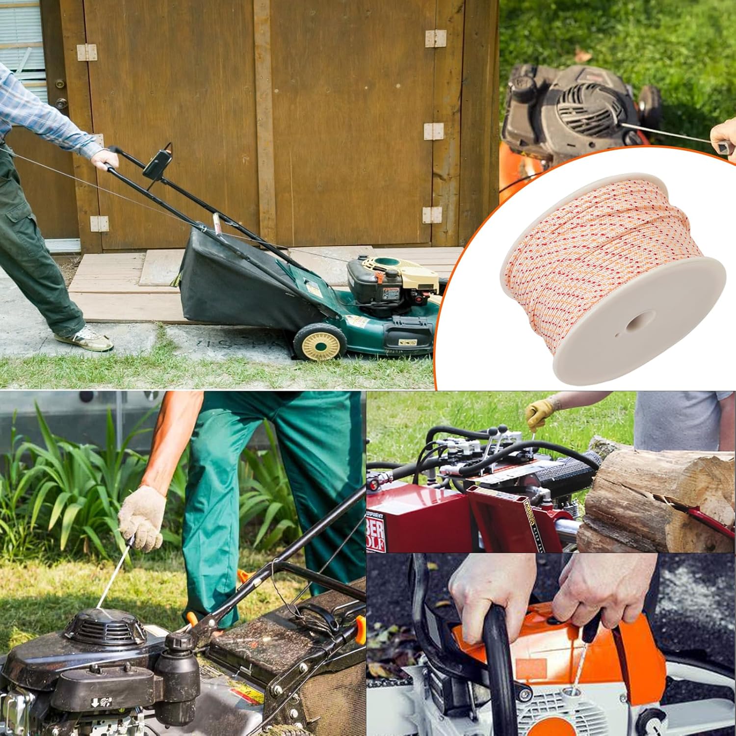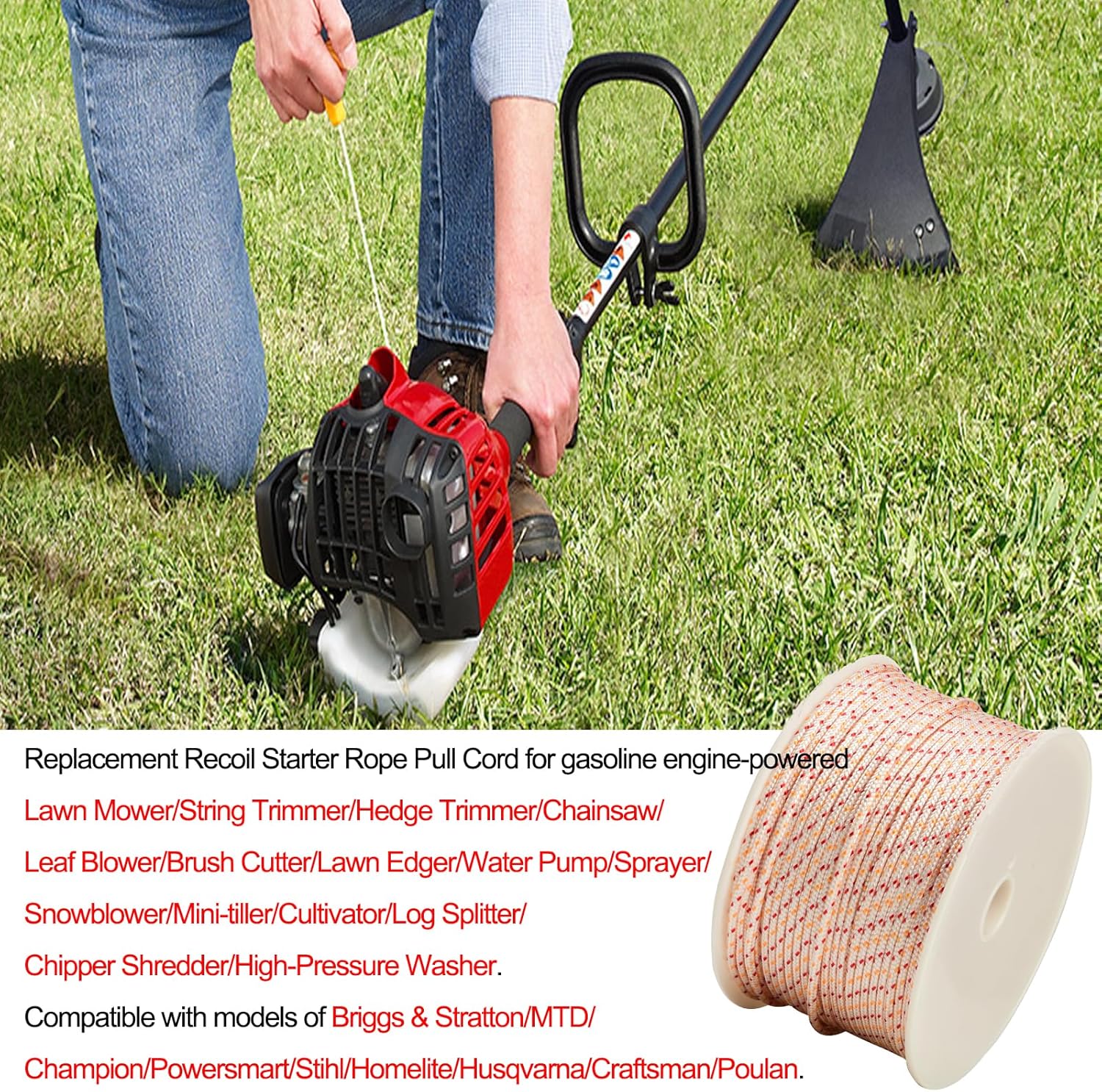 ✔【Wide Application】The pull starter rope for gasoline engine-powered Lawn Mower, String Trimmer, Hedge Trimmer, Chainsaw, Brush Cutter, Lawn Edger, Water Pump, Snowblower, Mini-tiller, Cultivator, Log Splitter, Chipper Shredder, High-Pressure Washer, etc. Compatible with models of Briggs and Stratton, MTD, Champion, Powersmart, Stihl, Homelite, Husqvarna, Honda, Craftsman, Poulan, etc.