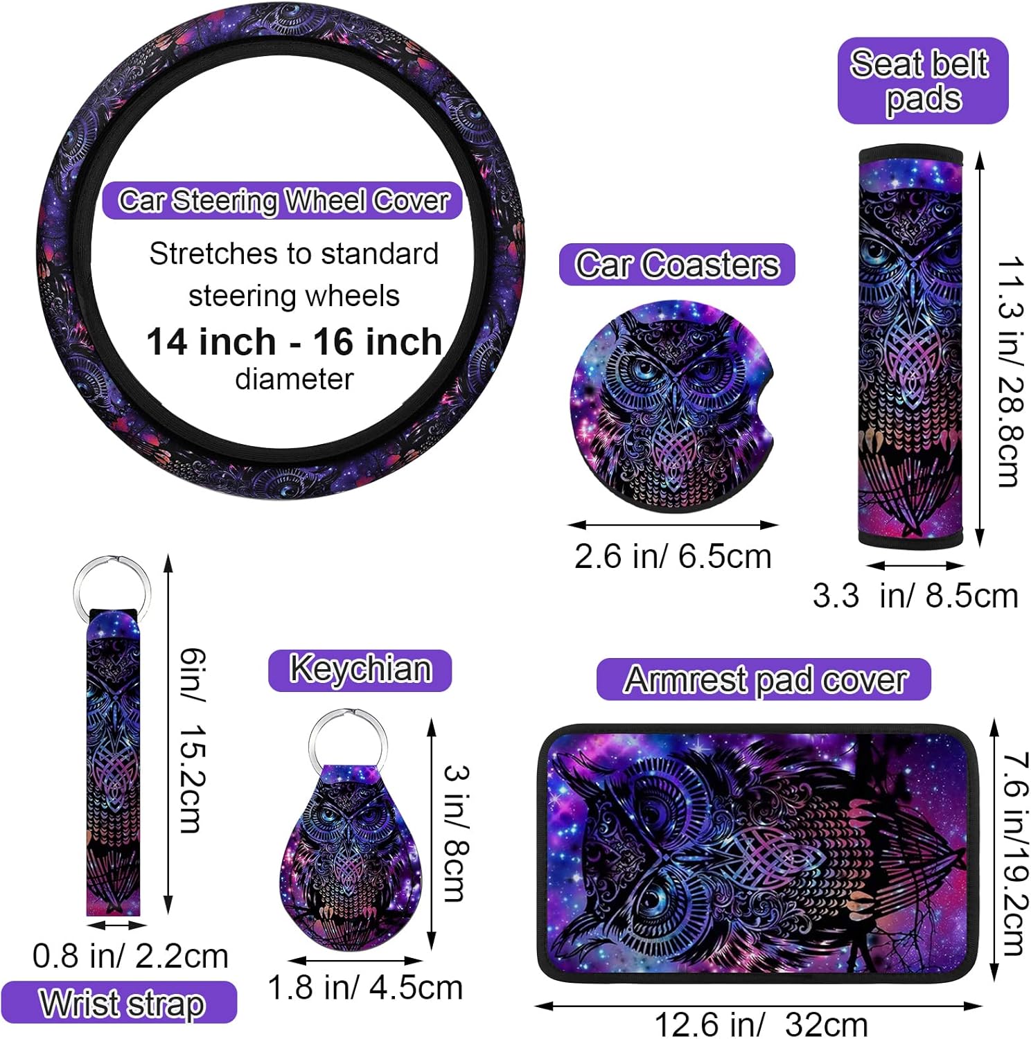 Owl Car Seat Cover Complete Set: this set includes 7 pcs owl front and rear seat covers, 2 pcs shoulder pads, 2 pcs car cup mats, 1 pcs steering wheel cover, 1 pcs armrest pad, 1 pcs key chain, 1 pcs wrist strap, full set The car interior can not only meet your car decoration, but also make your car look particularly stylish and clean, especially suitable for women’s car seat covers