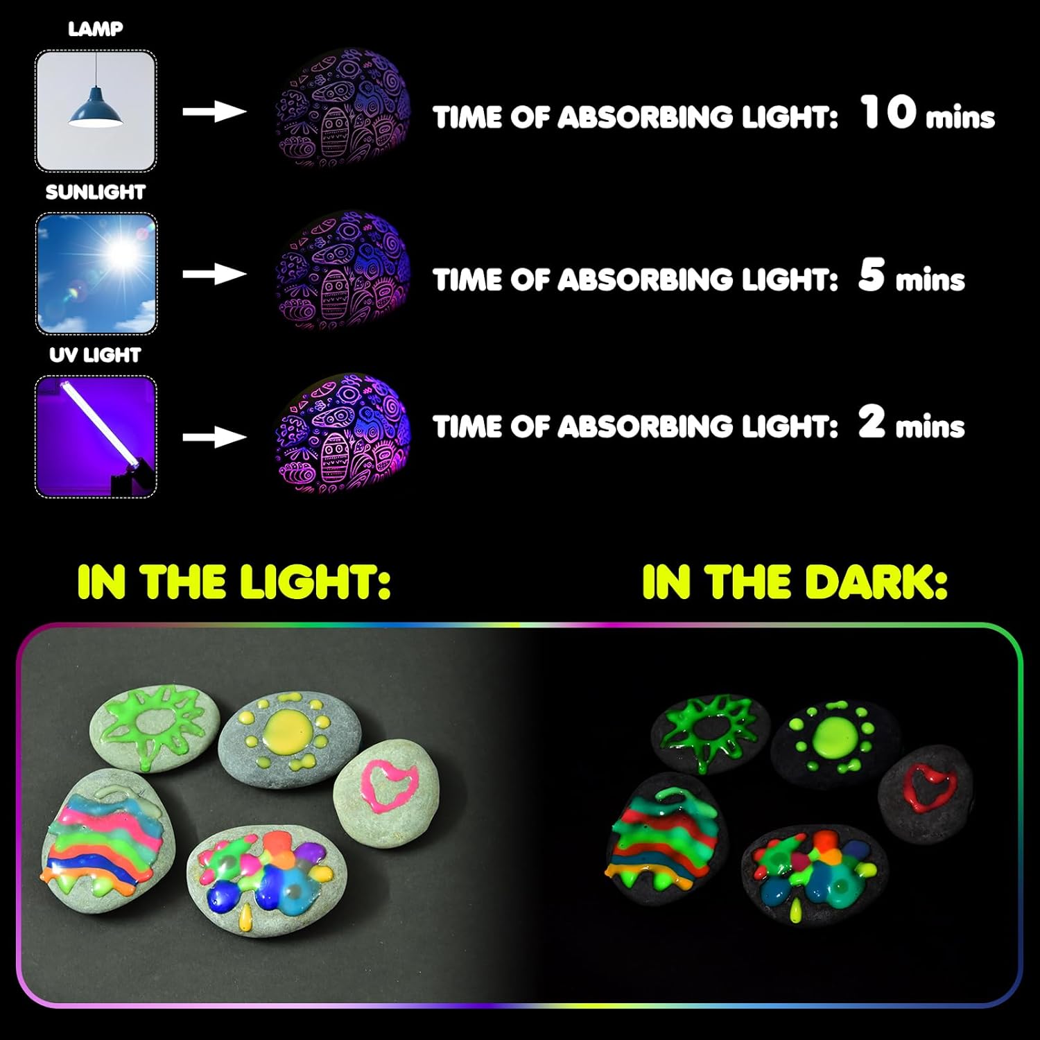 Long-lasting Luminous: Our neon acrylic paint set features high-quality pigments, great light fastness, and gloss finish.This glow in the dark paint have generous pigments to ensure that each color will glow for hours after absorbing light under light sources. It is recommended to be used with black or uv light for better effect