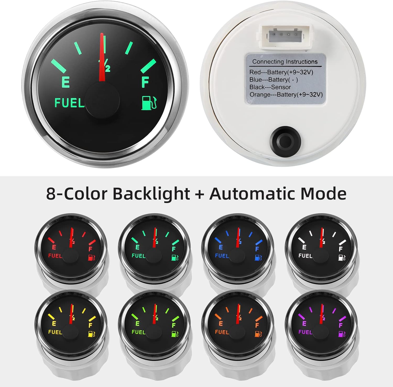 High sensitivity and easy operation.The diameter is 52mm 2”, indication range: E-1/2-F, working voltage: 9-32VDC (suitable for 12V-24V vehicle or engine), with wiring instructions.