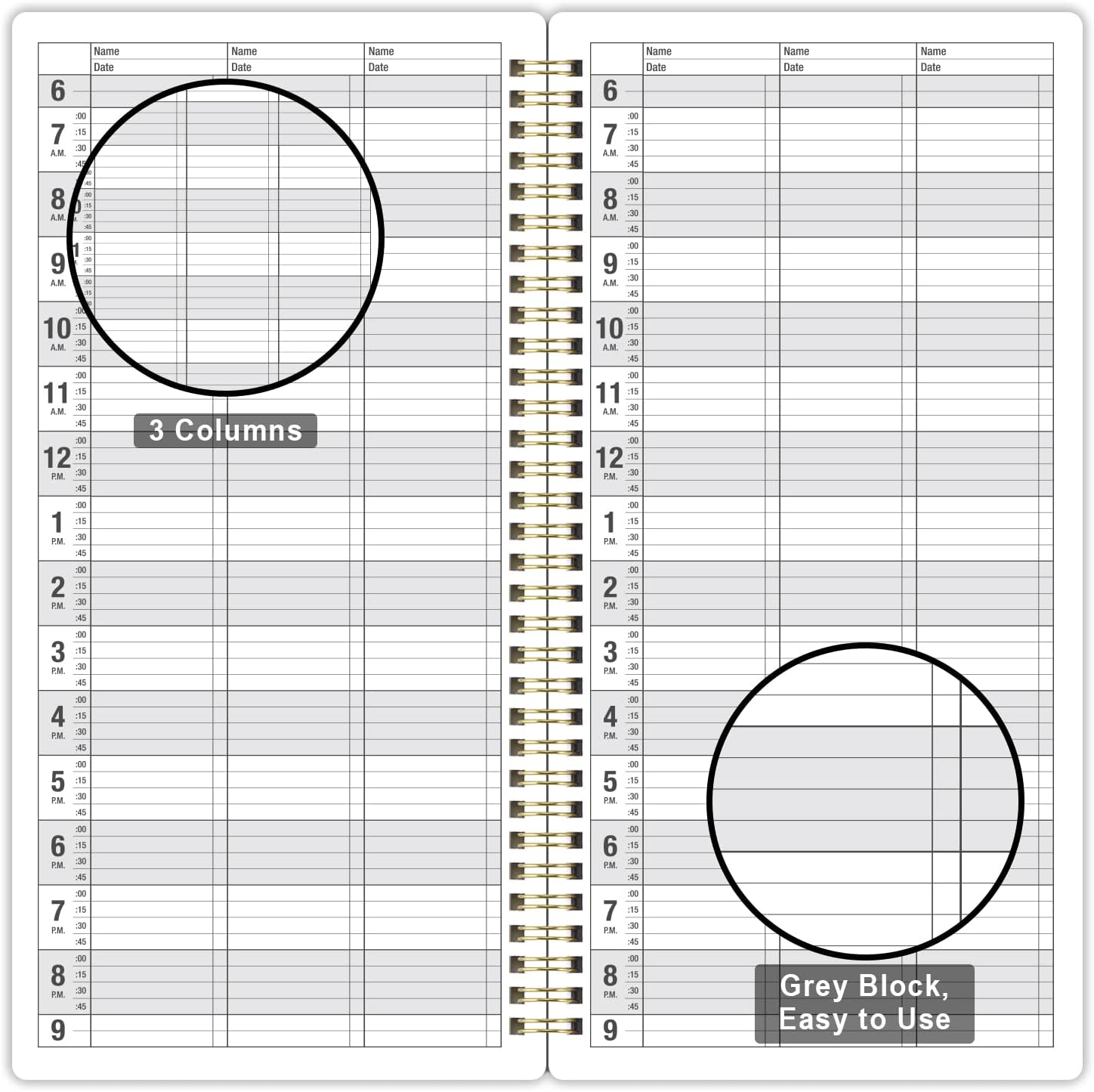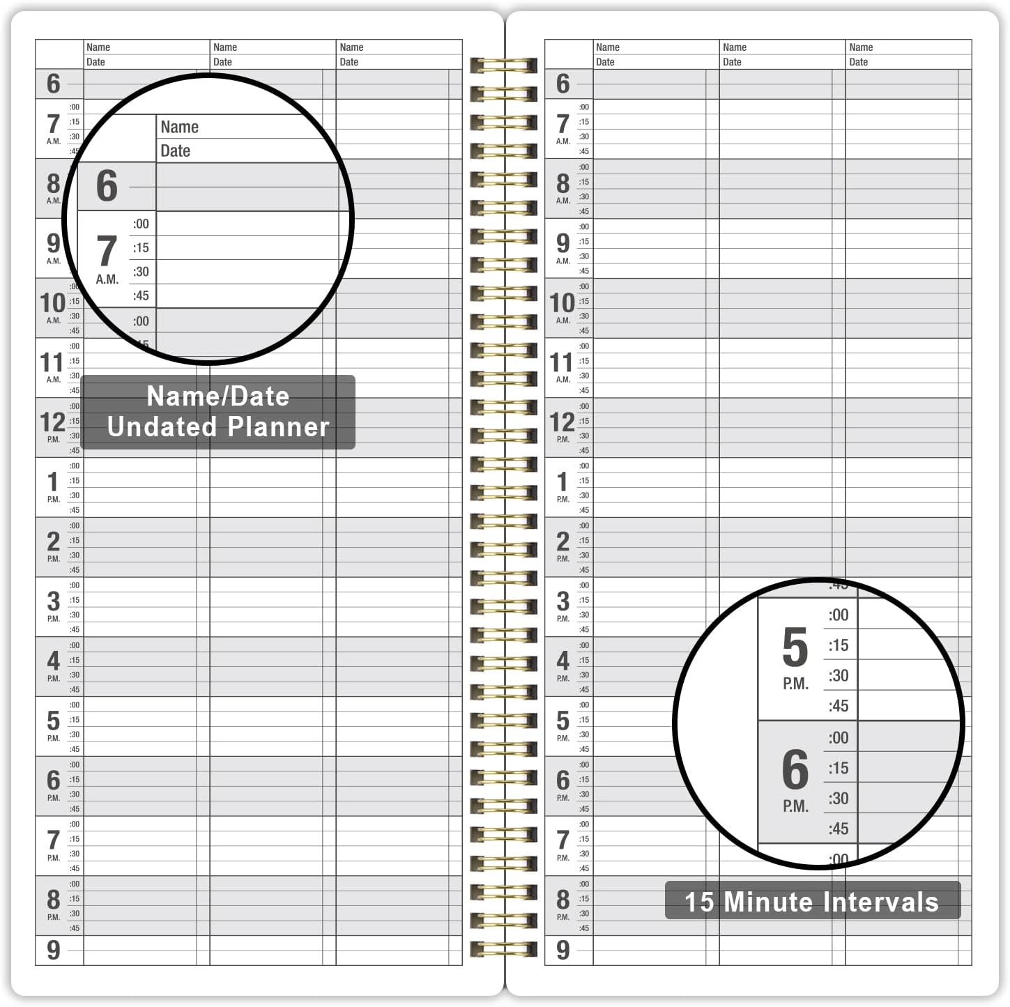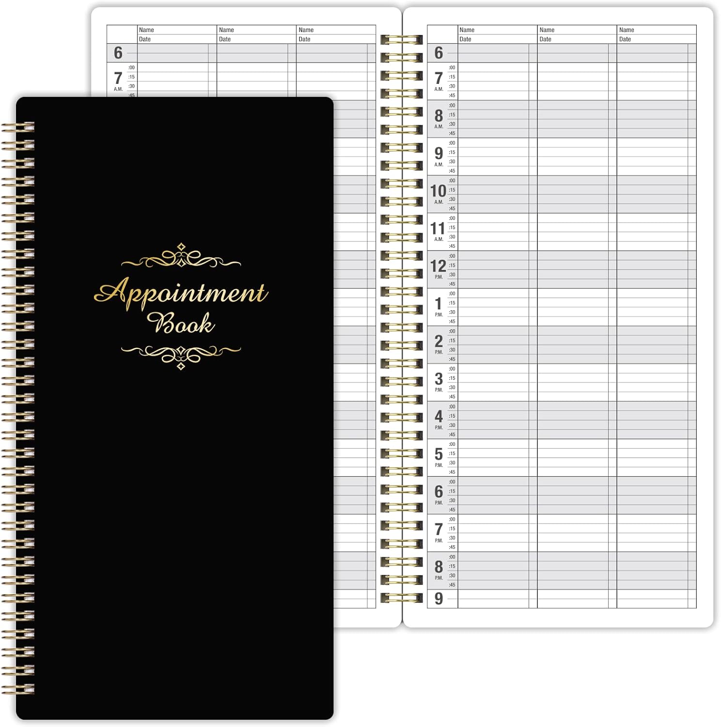 Color of appointment book: Classic blackSize of appointment book:6.1’’ x 11.54’’ x 0.95’’ InchesPages of appointment book: 3 columns (6 columns when open), 200 pages, offers lots of writing space.Date of appointment book: Undated, 6 AM – 9 PM, 15-minute increments. You can start it on whatever day of the week you want~!Material of appointment book: Premium Paper, Hardcover
