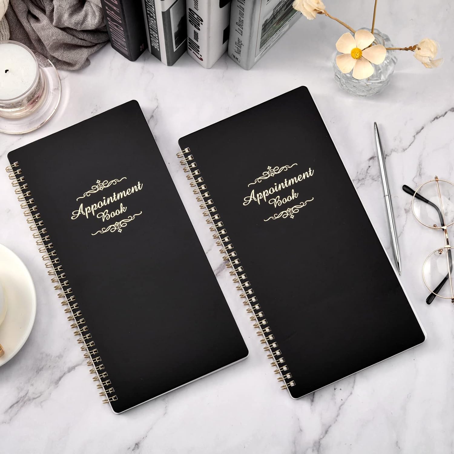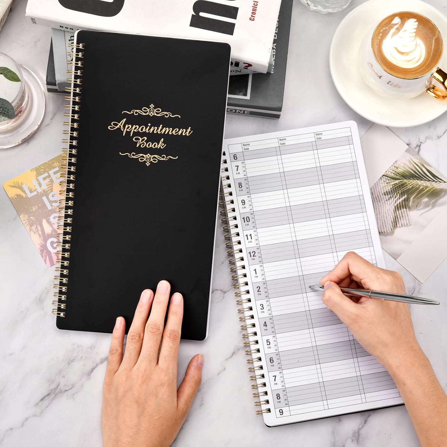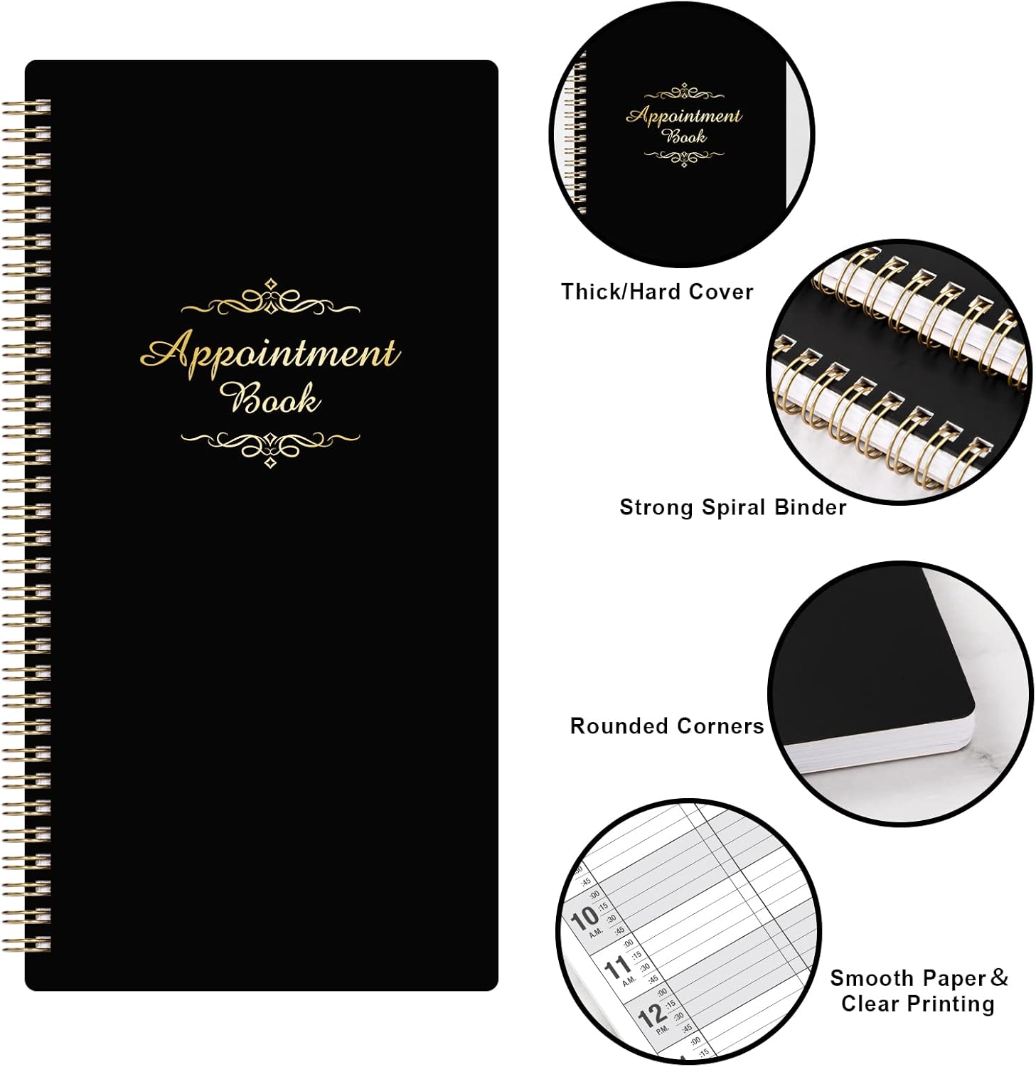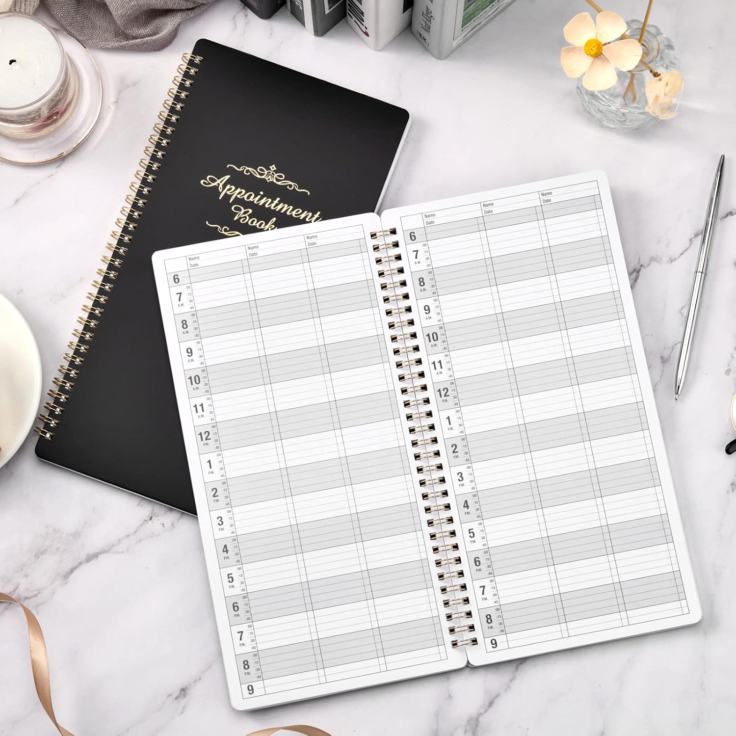 Color of appointment book: Classic blackSize of appointment book:6.1’’ x 11.54’’ x 0.95’’ InchesPages of appointment book: 3 columns (6 columns when open), 200 pages, offers lots of writing space.Date of appointment book: Undated, 6 AM – 9 PM, 15-minute increments. You can start it on whatever day of the week you want~!Material of appointment book: Premium Paper, Hardcover