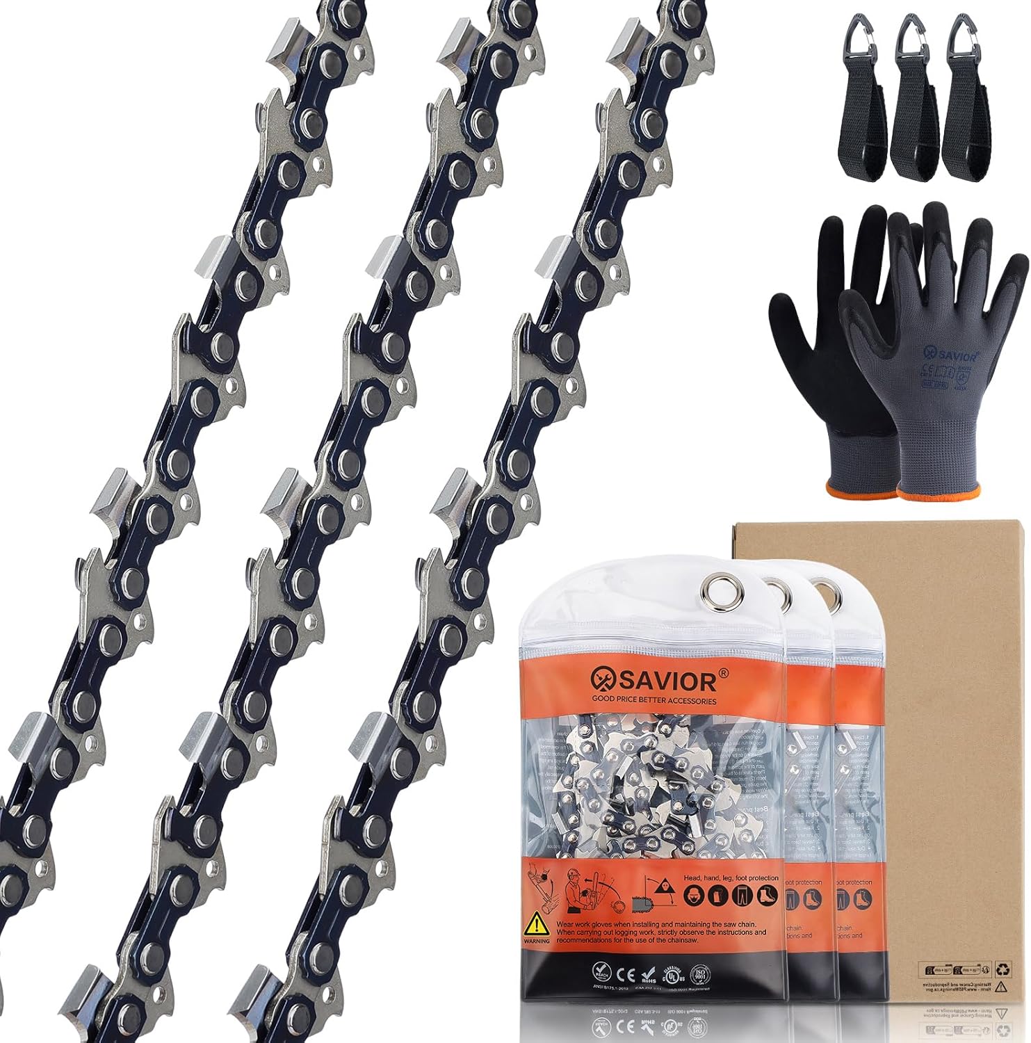 【Package Includes】: 3* Saw chain, 3* Storage bag, 1* Pair of gloves(XL/10), 3* Velcro. (Gloves can be used to replace the chain and isolate the lubricating oil on the surface, but not anti-cut!!!! Velcro can prevent chain from tangling, velcro can bear about 33lb/15KG weight, reusable velcro can holds things in place and attaches to backpack or cart to carry more things in outdoors.)