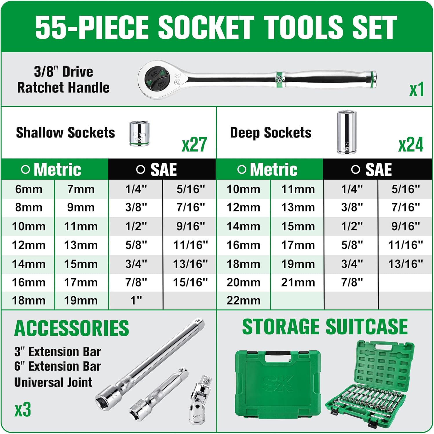 Including 14 pcs metric shallow sockets 6, 7, 8, 9, 10, 11, 12, 13, 14, 15, 16, 17, 18, 19 mm; 13 pcs metric deep sockets 10, 11, 12, 13, 14, 15, 16, 17, 18, 19, 20, 21, 22 mm; 13 pcs SAE shallow sockets 1/4, 5/16, 3/8, 7/16, 1/2, 9/16, 5/8, 11/16, 3/4, 13/16, 7/8, 15/16, 1 Inch; 11 pcs SAE deep sockets 1/4, 5/16, 3/8, 7/16, 1/2, 9/16, 5/8, 11/16, 3/4, 13/16, 7/8 Inch. Clear size markings for easy identification