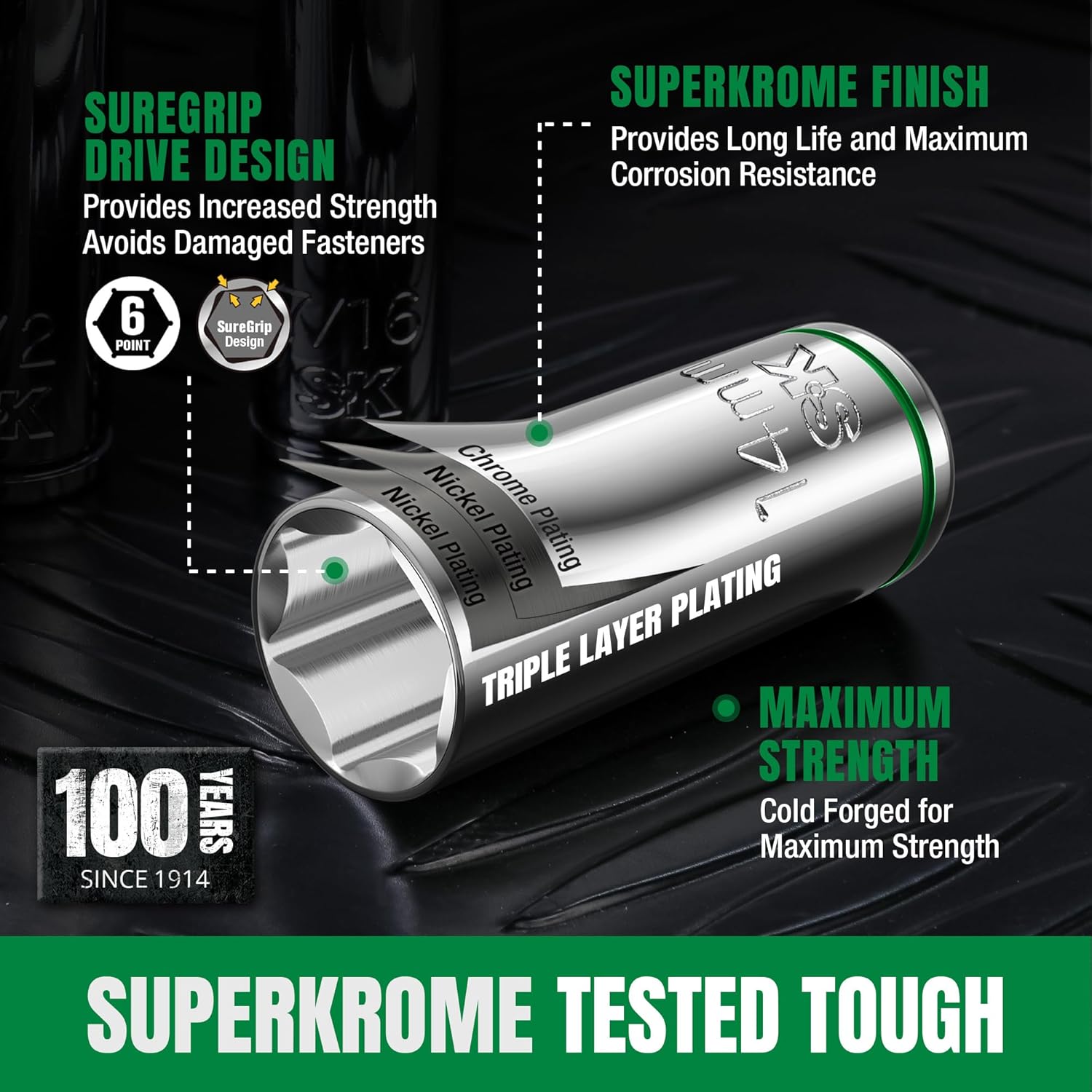 Heat treated Chrome Vanadium Steel ensures durability and extreme torque strength. SuperKrome Plating delivers toughest finish with high polish plating which results in jewelry-like finish providing long life and maximum corrosion resistance
