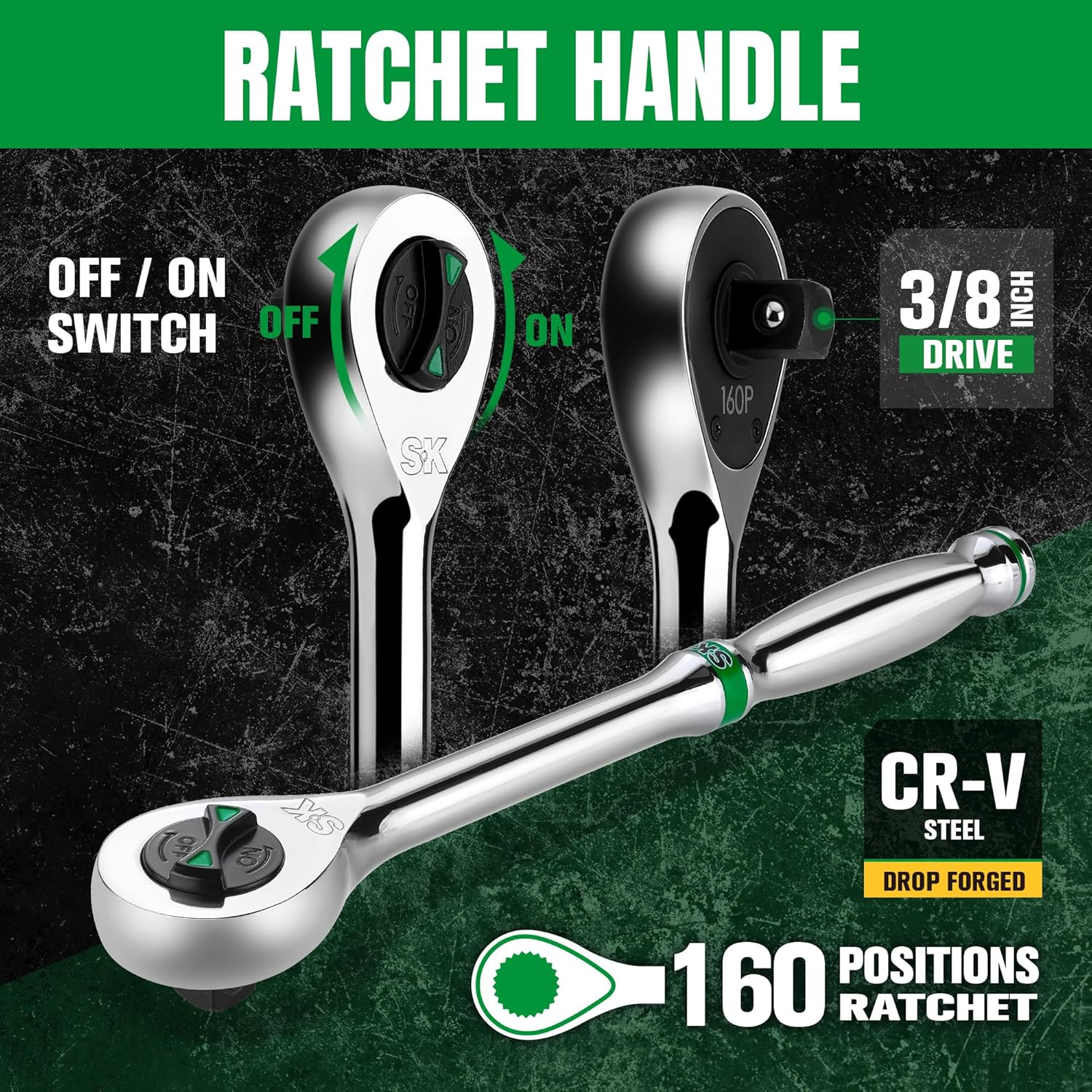 Comes with a professional thumbwheel ratchet. 160-position ratchet realizes a 2.25 ° swing arc to turn a fastener in tight space with ease. Thumbwheel design enables you to tighten or loosen fasteners with a flip of thumb