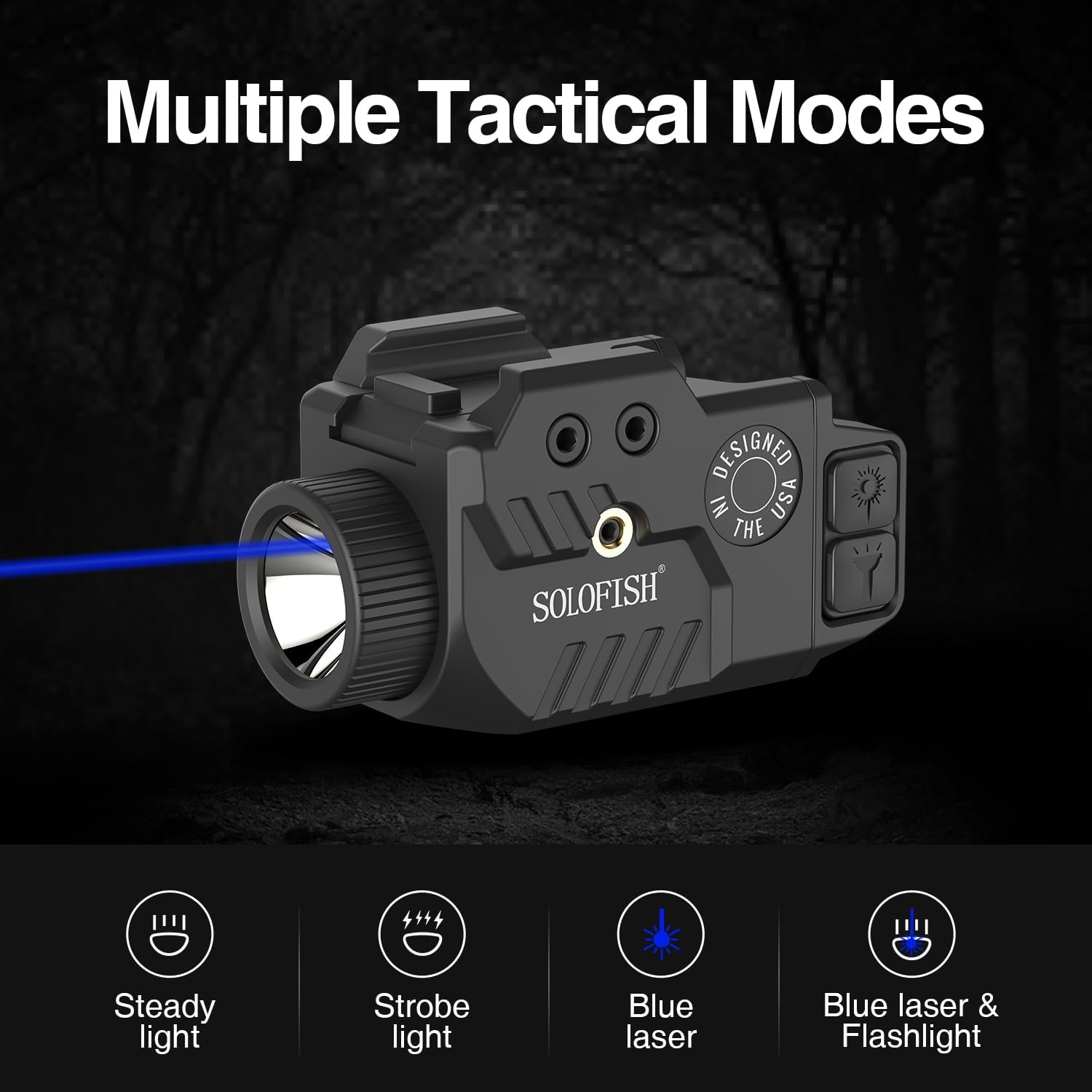【Multiple Tactical Modes】Strobe + Steady blue laser/ flashlight modes are optional with Ambidextrous Button.