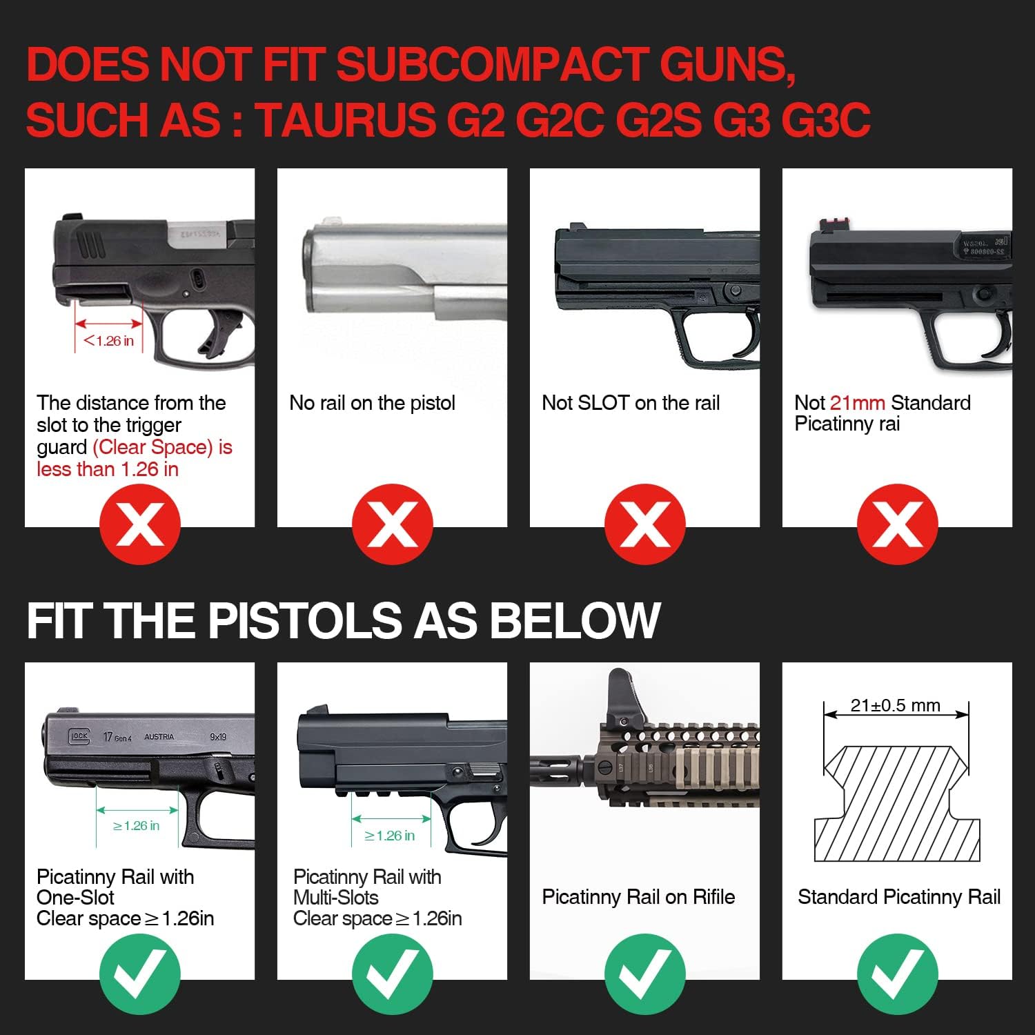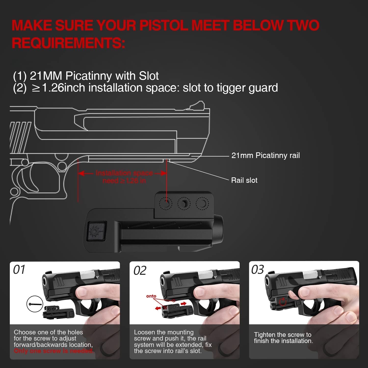 【21MM Picatinny + 1.26 inch Installation Space Required】There are Three alternative screw holes on the red beam, choose one for your preference and use the ONLY ONE SCREW to install the sight in a perfect location on your 21MM rail with cross slot. Also make sure your pistol have 1.26 inch Installation Space from cross slot to trigger guard.