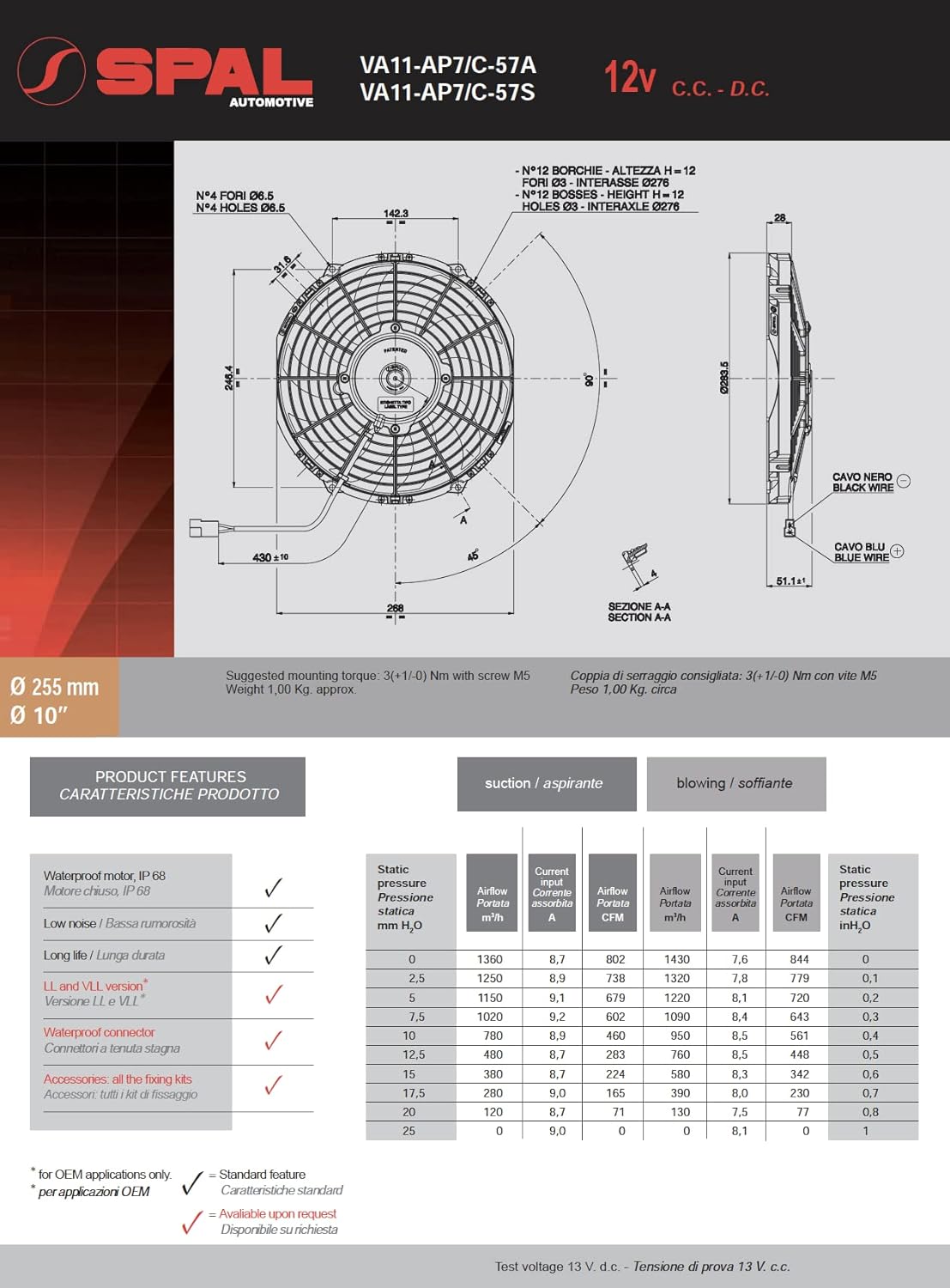 - ๐ง OEM-Grade Quality: SPAL 30100435 | VA11-AP7/C-57A 10″ electric fan is engineered in Italy to meet the highest automotive and industrial standards, ensuring unmatched reliability and performance.