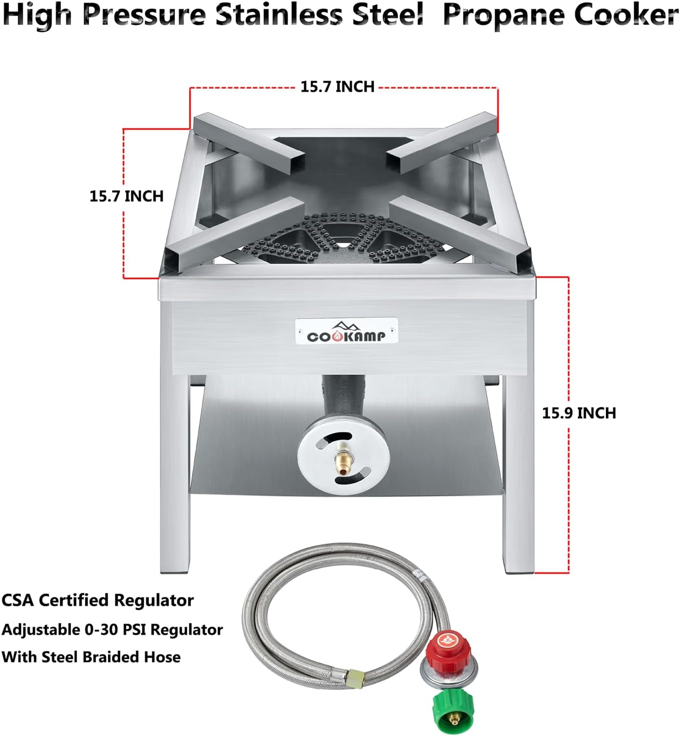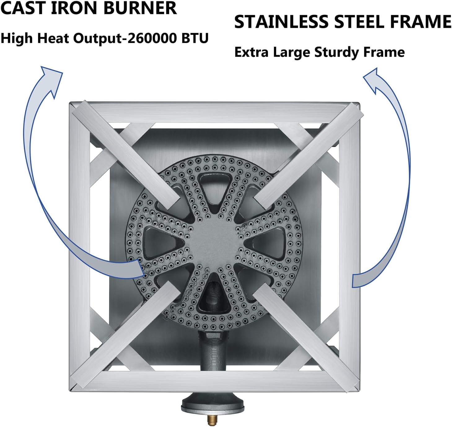 STAINLESS STEEL FRAME- The propane burner is constructed with all-welded stainless steel. Durable, sturdy, and long-lasting.