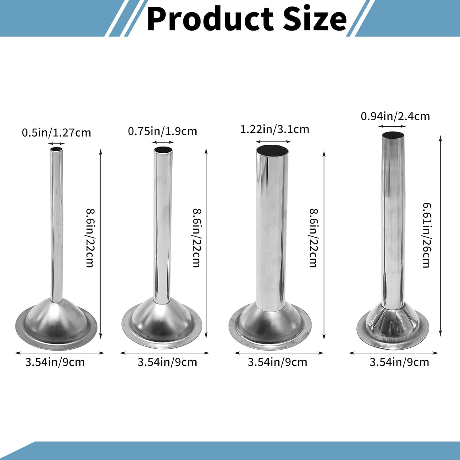 Product Type: Sausage Stuffer Tubes Brand: Saihisday Material: Stainless steel Sizes: Includes 4 stuffing tubes with diameters of 1 1/4”, 1”, 3/4”, and 1/2” Cleaning Method: Dishwasher safe