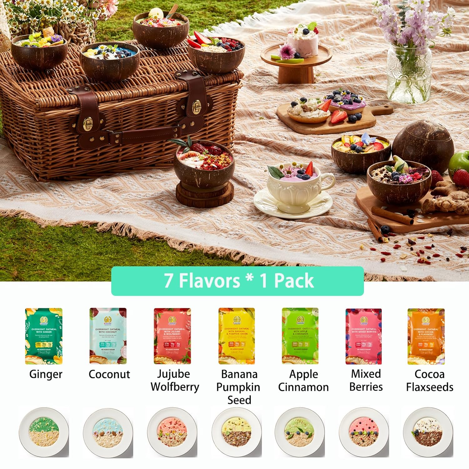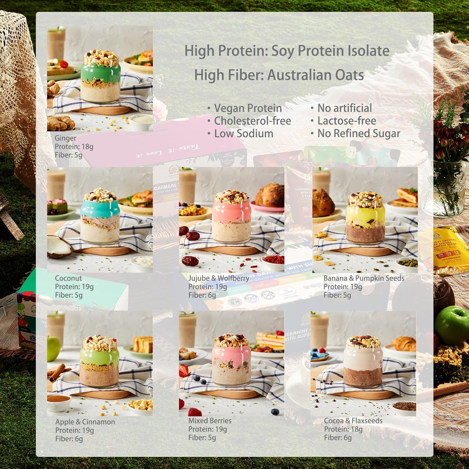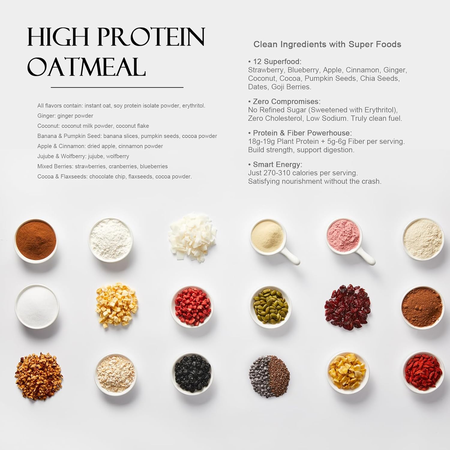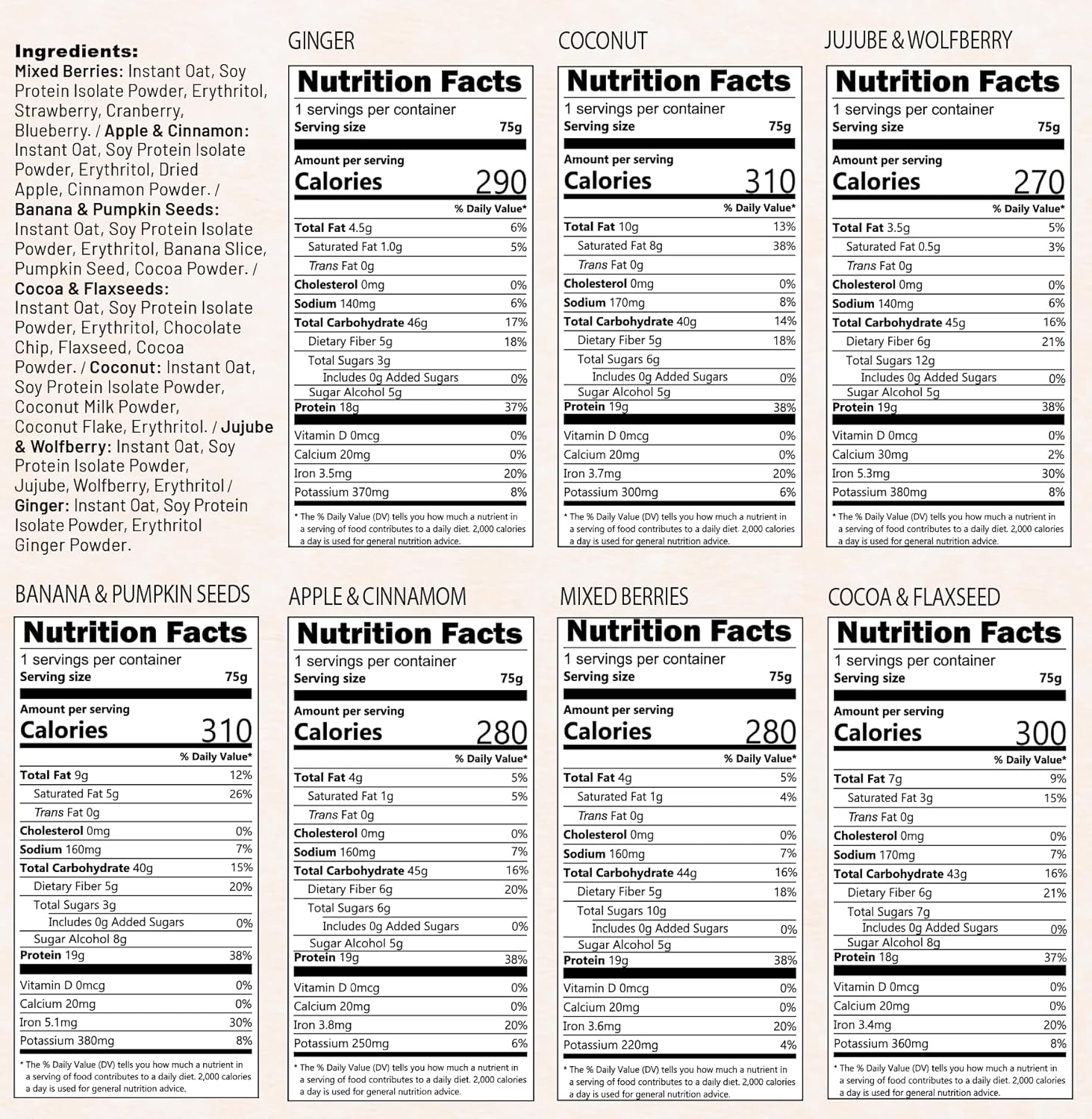 [7 Flavors with Superfoods] All flavors contain: instant oat, soy protein isolate powder, erythritol. [Ginger] ginger powder./ [Coconut] coconut milk powder, coconut flake./ [Banana & Pumpkin Seed] banana slices, pumpkin seeds, cocoa powder./ [Apple & Cinnamon] dried apple, cinnamon powder./ [Jujube & Wolfberry] jujube, wolfberry./ [Mixed Berries] strawberries, cranberries, blueberries./ [Cocoa & Flaxseeds] chocolate chip, flaxseeds, cocoa powder. Skip the food stockpile – enjoy many super-foods in one purchase.