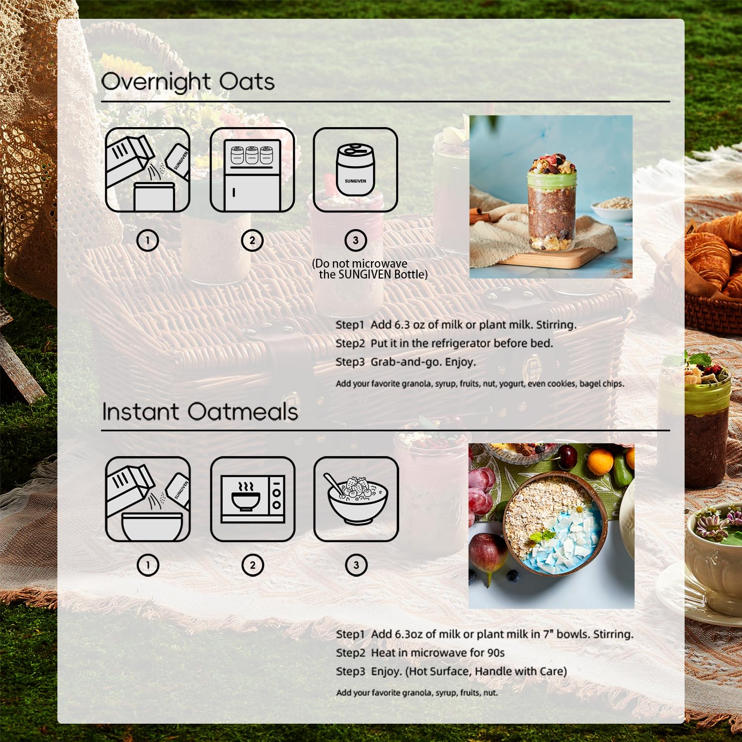 [Overnight or Instant] ①Overnight Oatmeal: oats + milk/plant milk → refrigerate overnight → grab and go, which is in time for your morning routine, and offers ice-cream-like creaminess. ②Instant Oatmeal: mix oats and 6.3oz milk(or plant milk), then heat in microwave for 1-2 min with 7” bowls(always use a microwave-safe container large enough to avoid boiling over ) as a cozy winter treat.