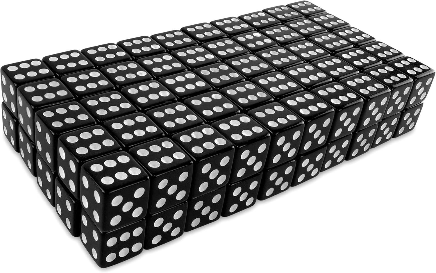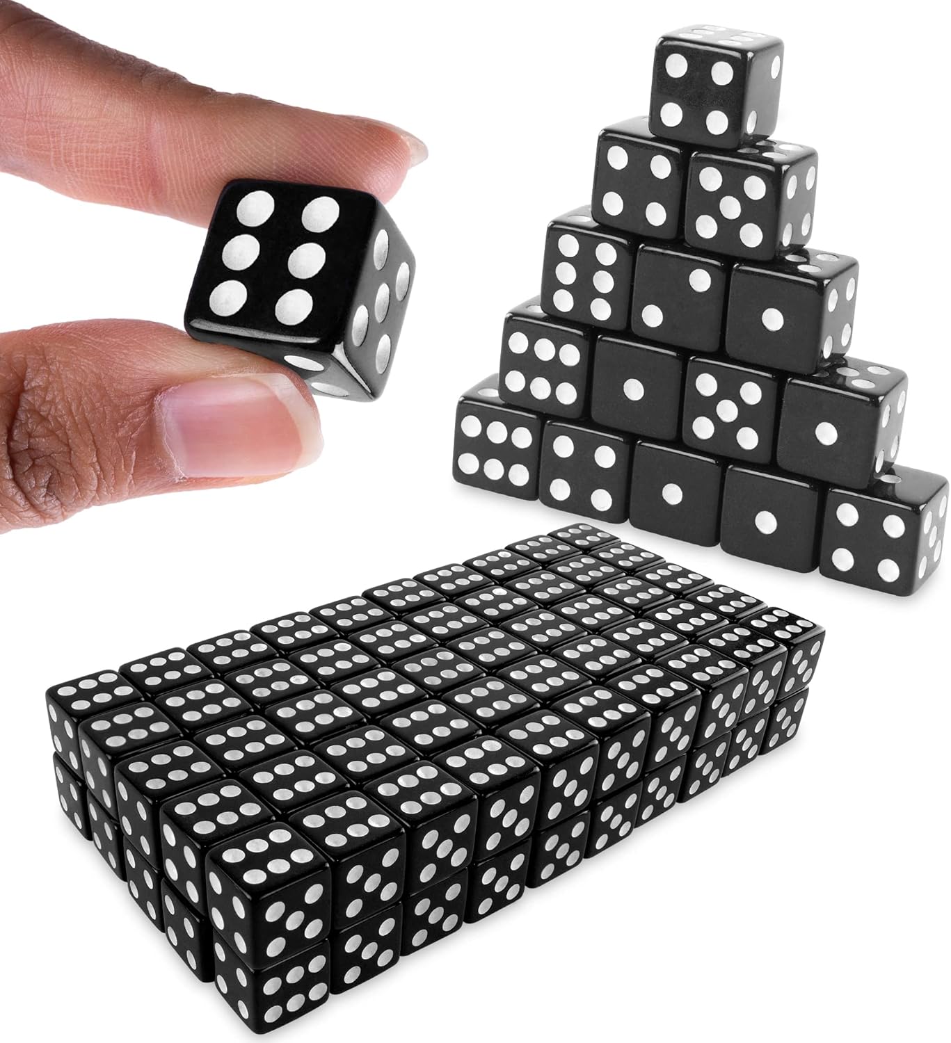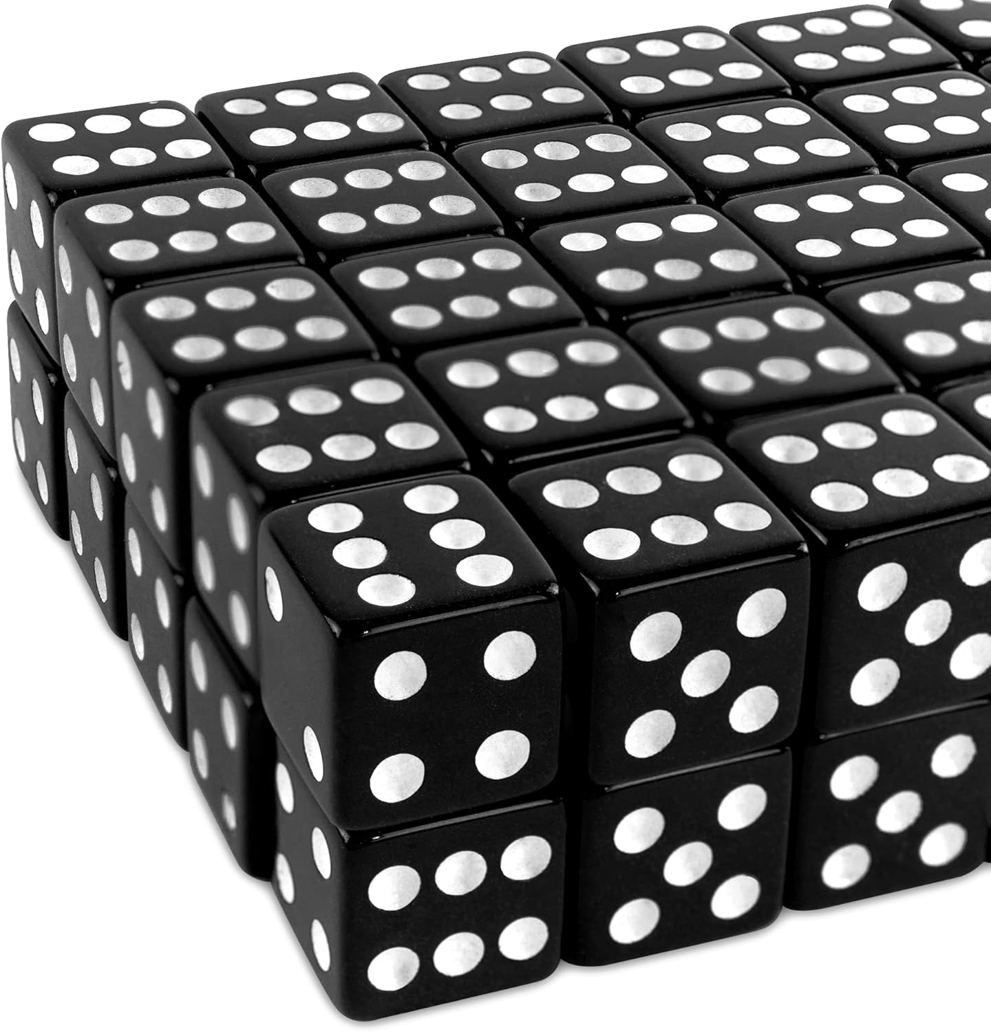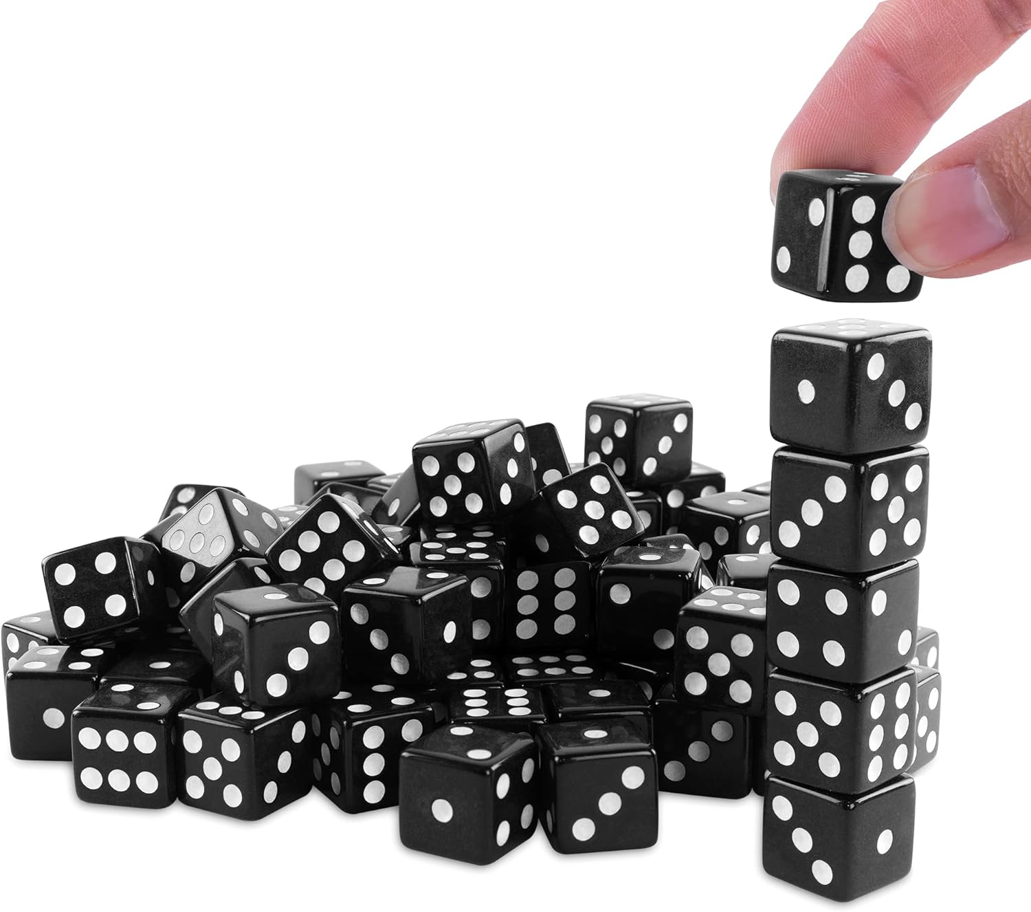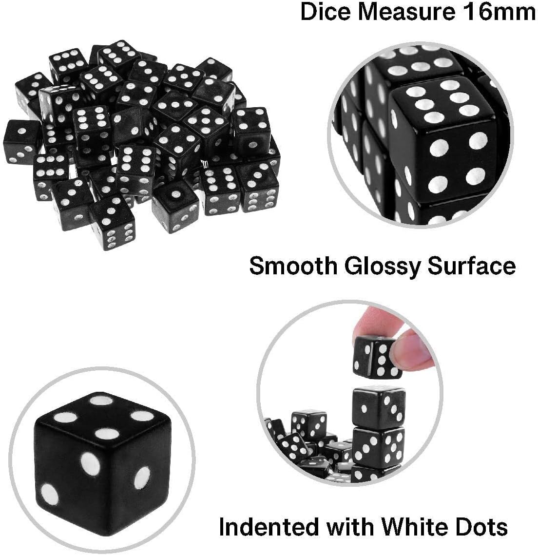 Package includes 100 black cubic dice with white pips (dots). Each die measures 16mm on each side.Pip spots etched onto the surface of the and painted white.