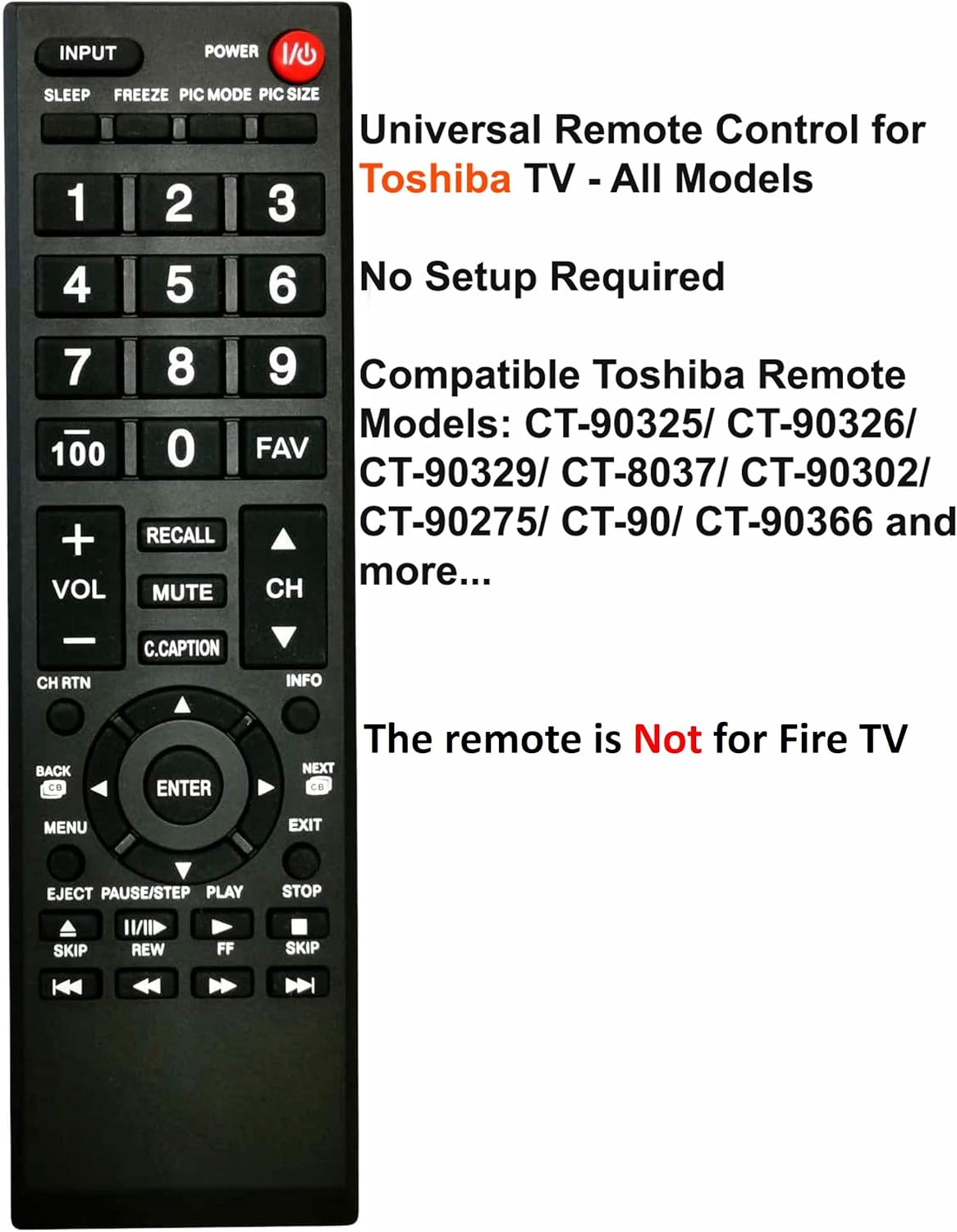 Compatible with Toshiba remote models:CT-90325,CT-90326,CT-90329,CT-8037,CT-90302,CT-90275,CT-90366 and more.