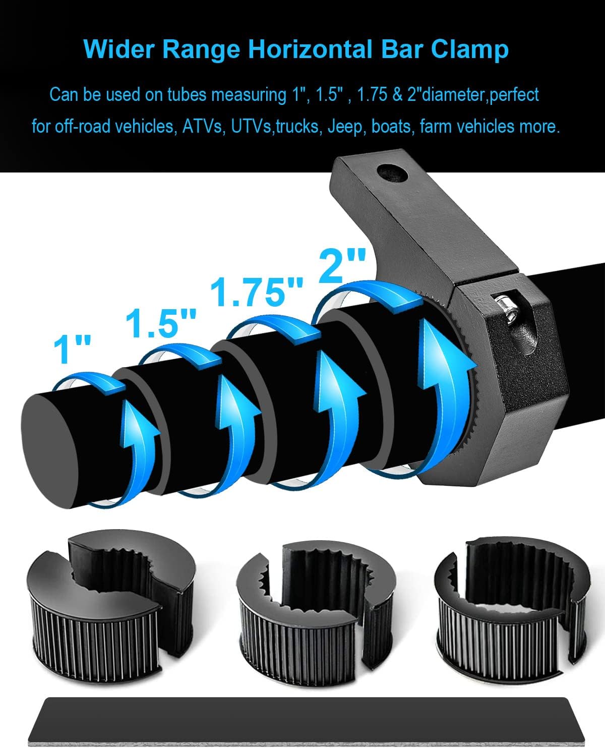 The bar clamp mounting kit comes with non-slip rubber insert to dampen driving vibration and avoid scraping bull bar surface