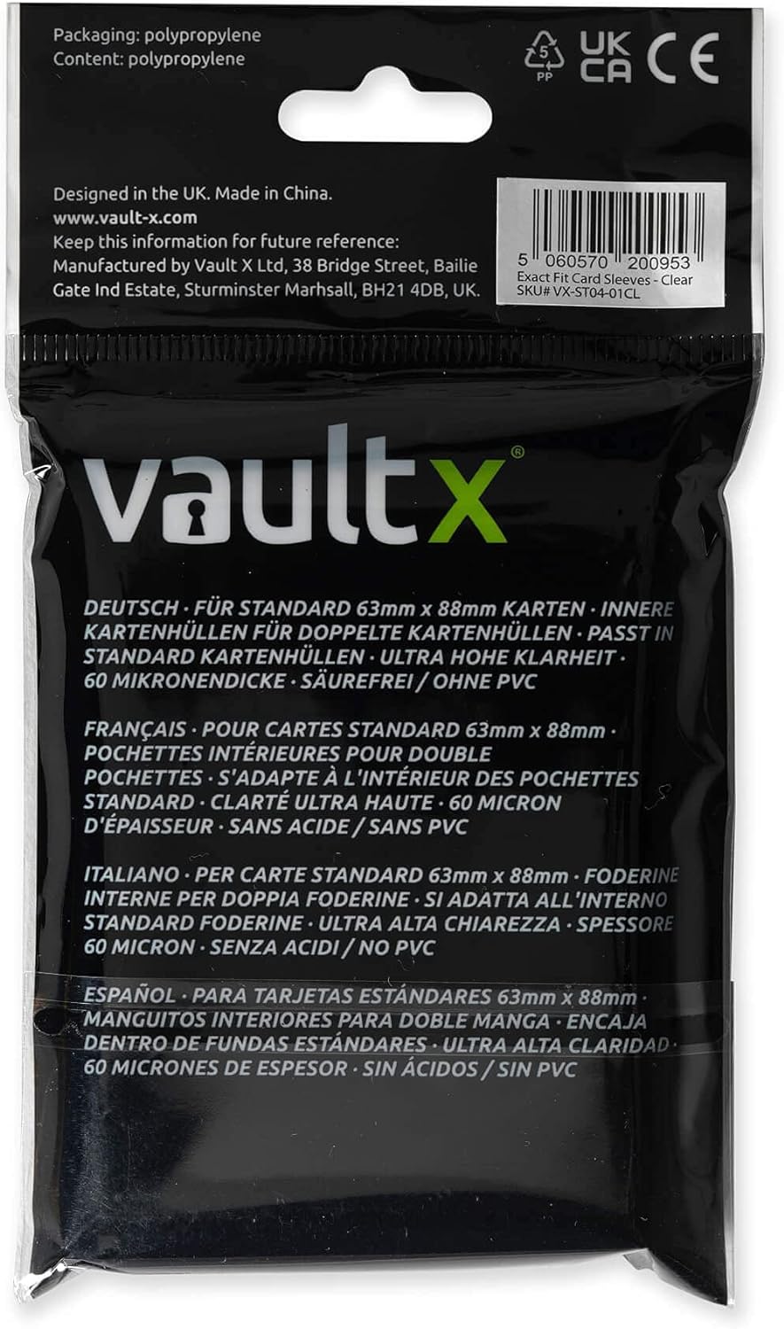 High clarity, premium quality exact fit trading card sleeves. Provide the perfect fit for all standard size 63mm x 88mm TCG cards. Made from archival-safe, acid-free non-PVC material. PROTECT- Vault X exact fits are made from 60 micron thick polypropylene. These card sleeves provide the perfect base for double sleeving or great single sleeve protection for your binder collection. EXACT FITÂ- Vault X inner sleeves have been designed to provide a precise fit for your trading cards. Pair with Vault X outer sleeves for ideal double sleeving and ultimate protection during play or cataloguing. PERFECT DESIGN- Vault X exact fit card sleeves are designed to fit a variety of standard sized cards. Compatible with Magic: The Gathering, Pokemon, Flesh & Blood, Force Of Will, Cardfight Vanguard, WoW, along with many more. SIZE64mm x 89mm. For cards up to 63mm x 88mm. Â – SHIPPING Â – We currently only ship to the United Kingdom from our website. Exact fits will also be available on the global Amazon marketplaces in the near future.